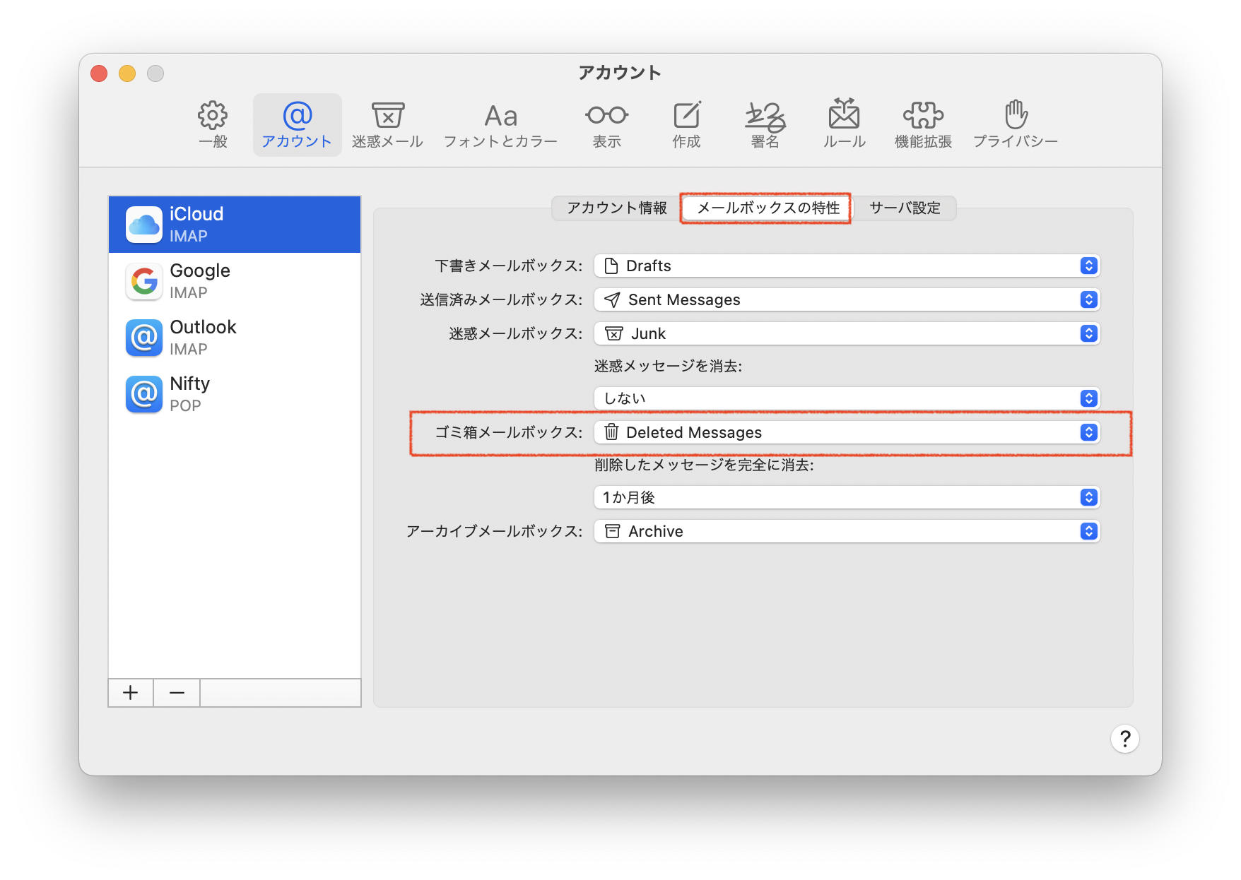 ニフティのアカウントの場合、小生の環境では、ですが、ゴミ箱の設定が細かくできないようです。