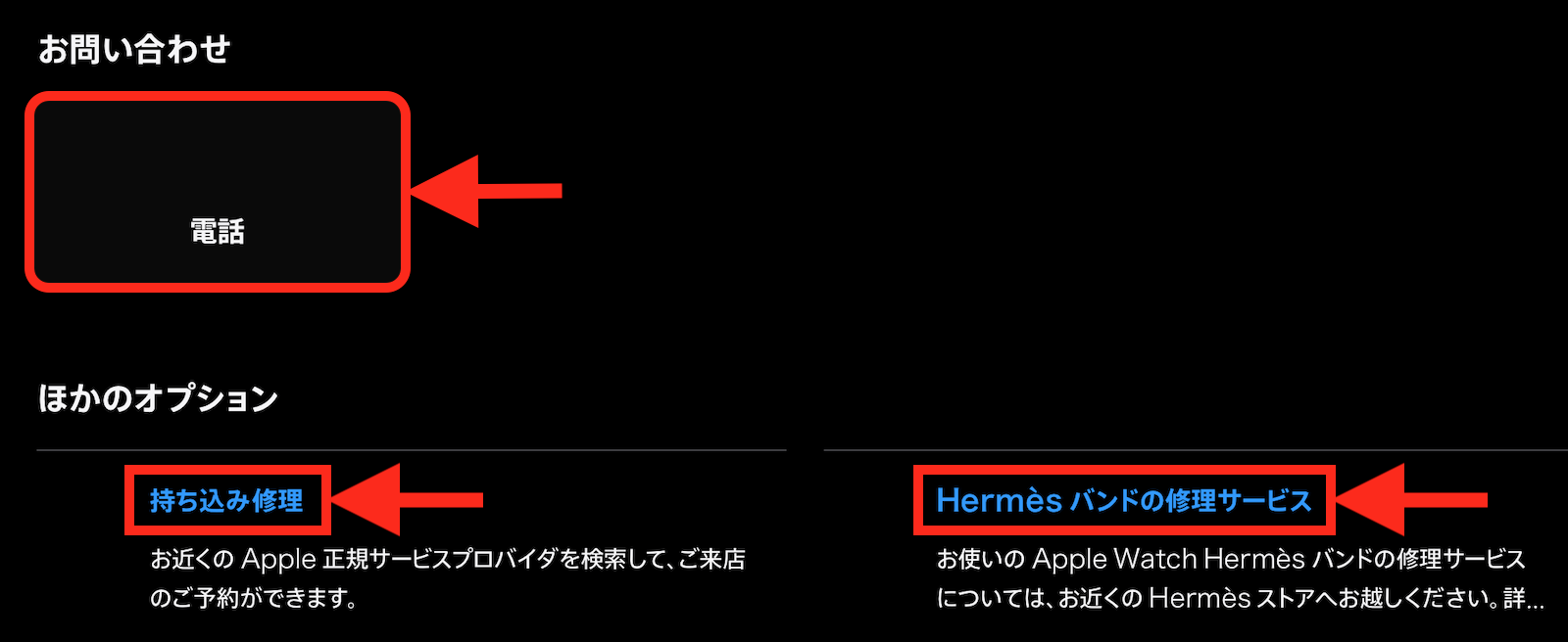 下記リンクの「Apple 純正アクセサリ」の項目の、Apple サポートに問い合わせる のリンクから、「バンドとアクセサリ」>「続ける」ボタンで、下の画像の様に 電話で問い合わせ るか、お近くの Apple 正規サービスプロバイダに予約して「持ち込み修理」を行う かのオプションが表示されます。