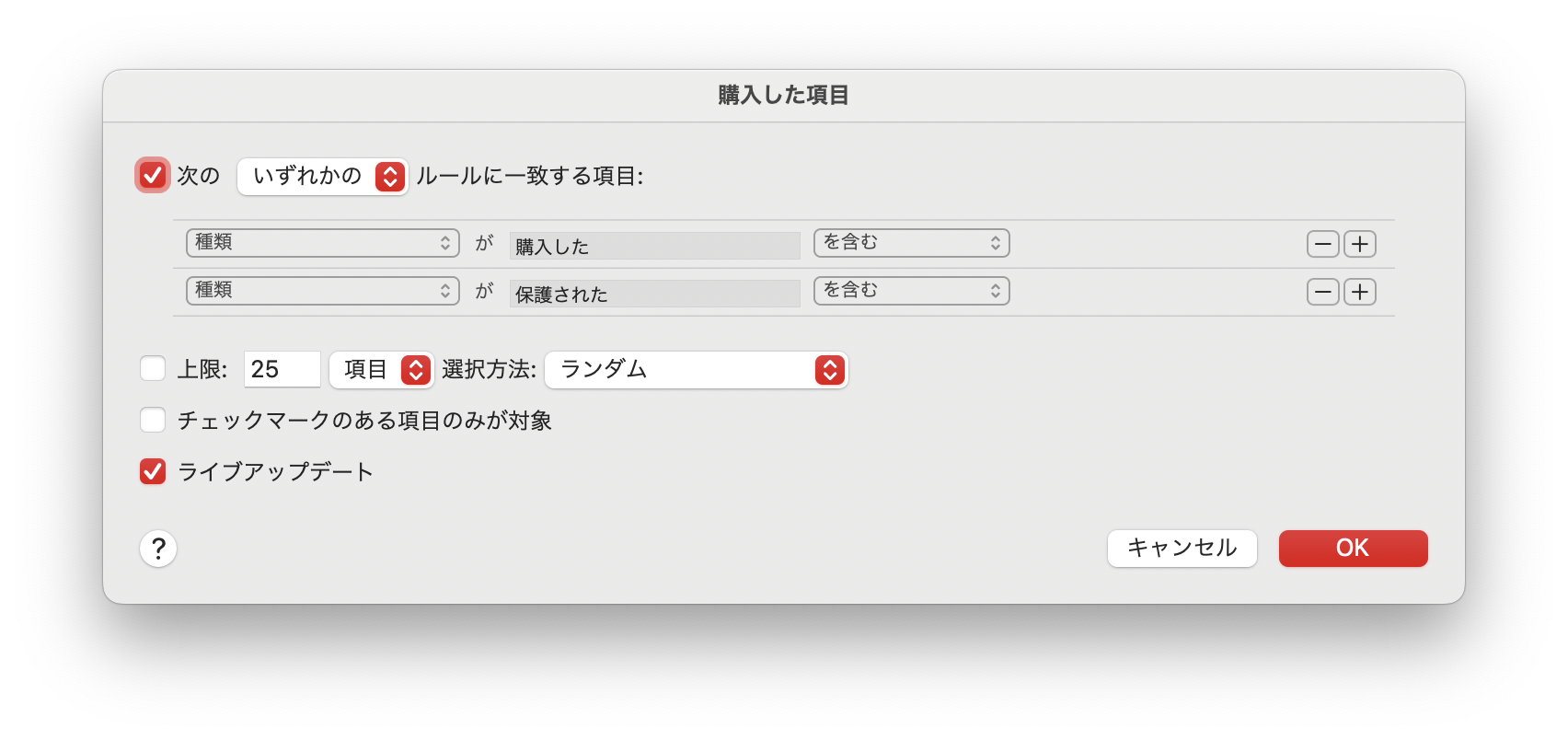 >「アカウント」→「購入した項目」に表示されている曲が、スマートプレイリストに反映されません