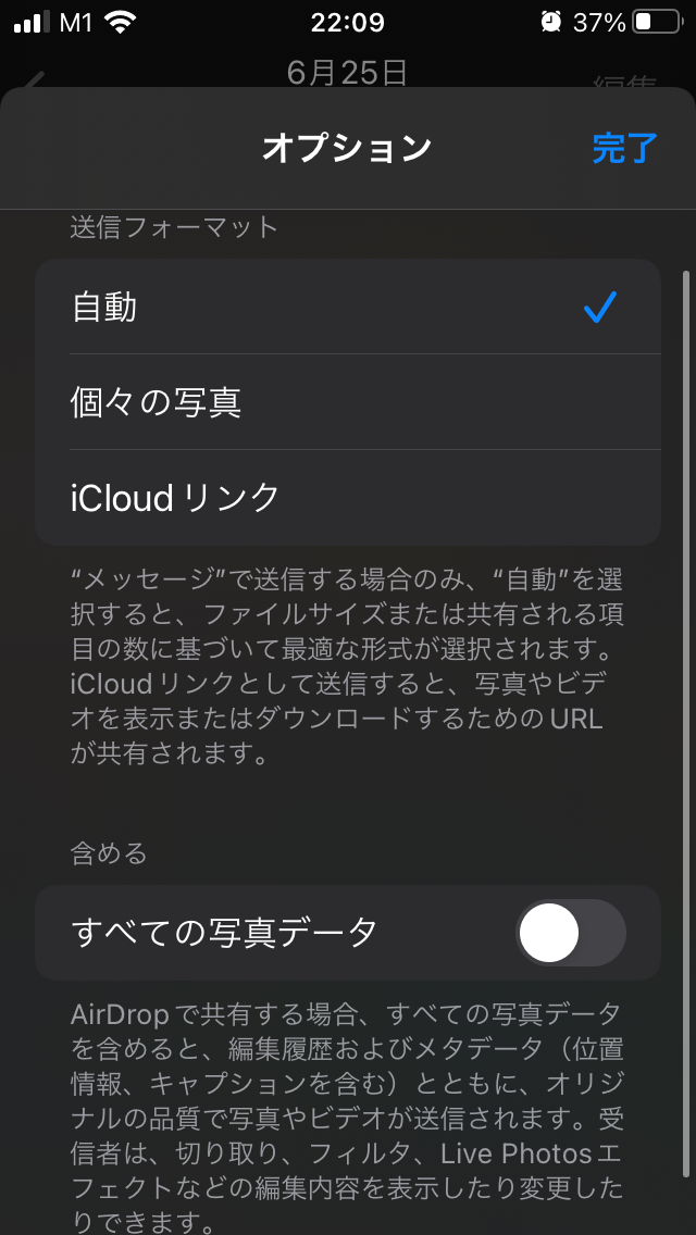 写真の共有ボタンを選択した時に 上に表示されるオプションの送信フォーマットが 自動になっているんでしょうか。