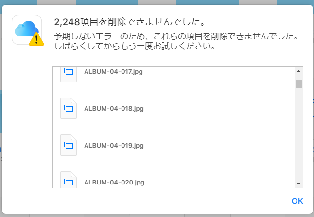 予期しないエラーのため削除できなかったという旨のメッセージが出ました。