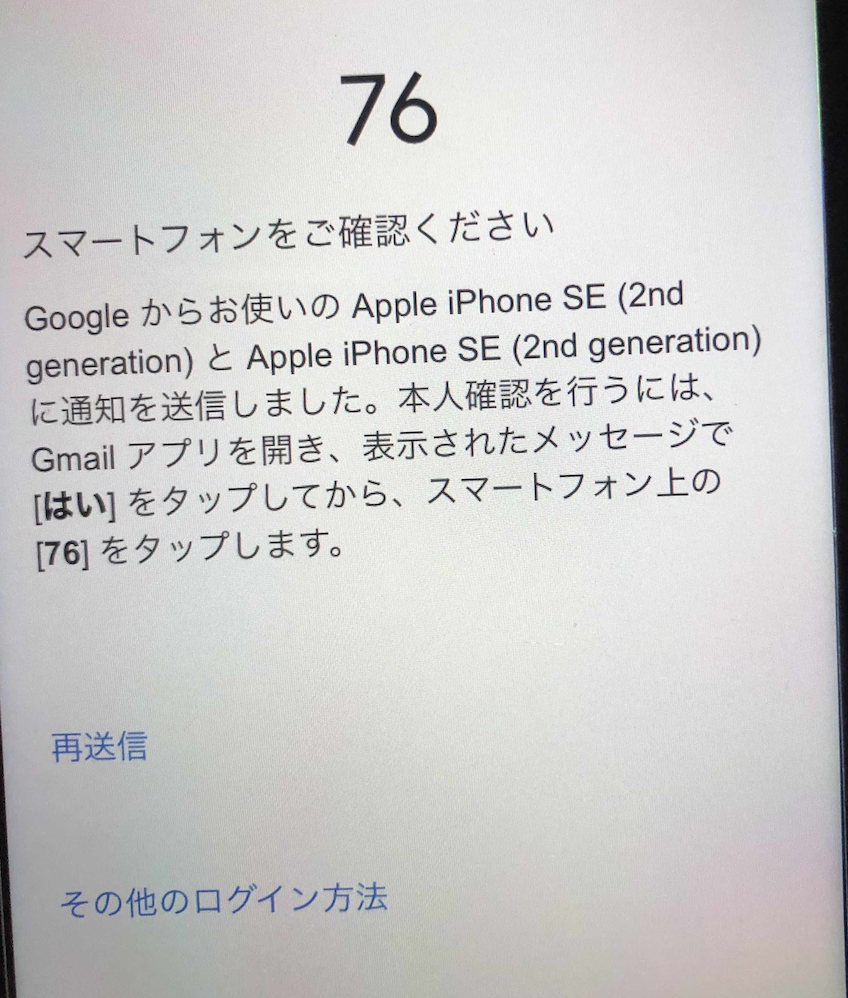Googleを再インストールしてID,パスワード入力したところ、本人確認の案内となり、番号とともにiphoneに通知を