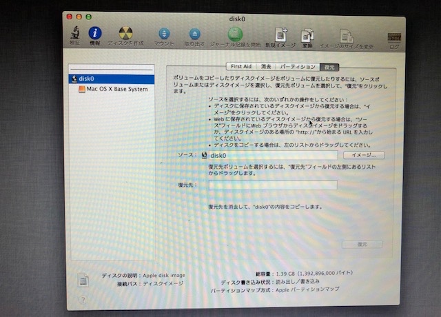 > 左のリストには、disk0の下にMac OS X base systemのみ表示