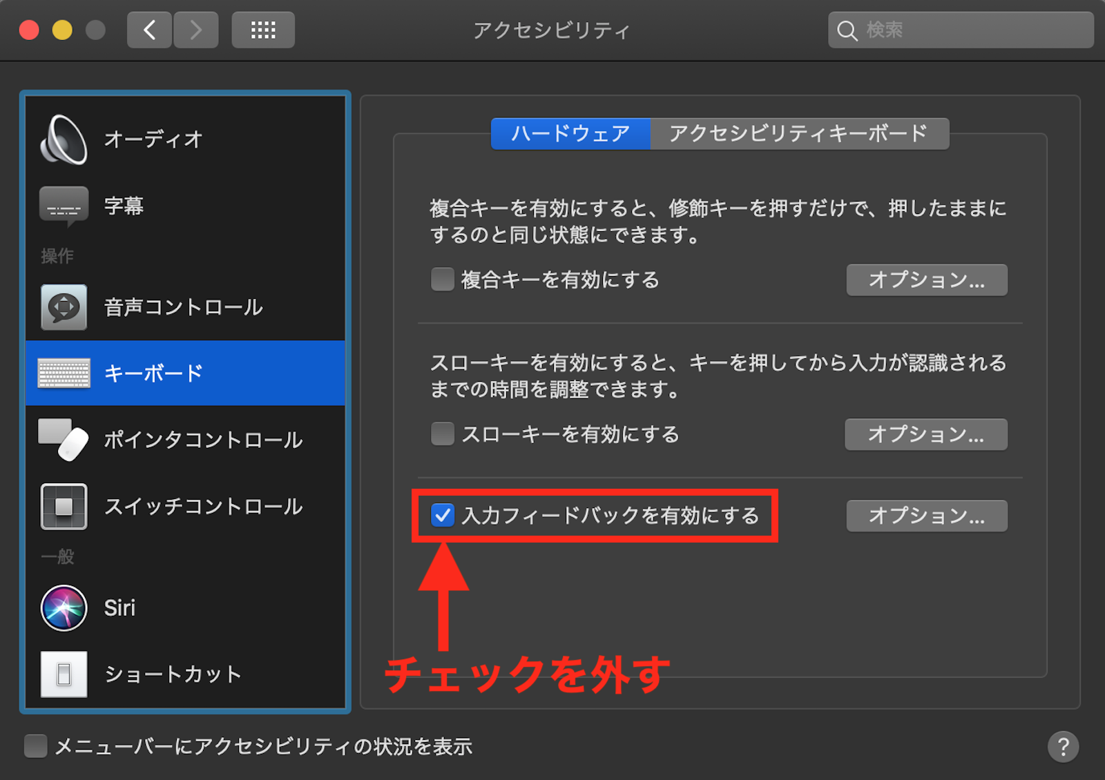 もしかして、下の画像の様に、「システム環境設定」>「アクセシビリティ」>「キーボード」>「ハードウェア」タブの「入力フィードバックを有効にする」の項目に、チェックが入っていませんでしょうか?