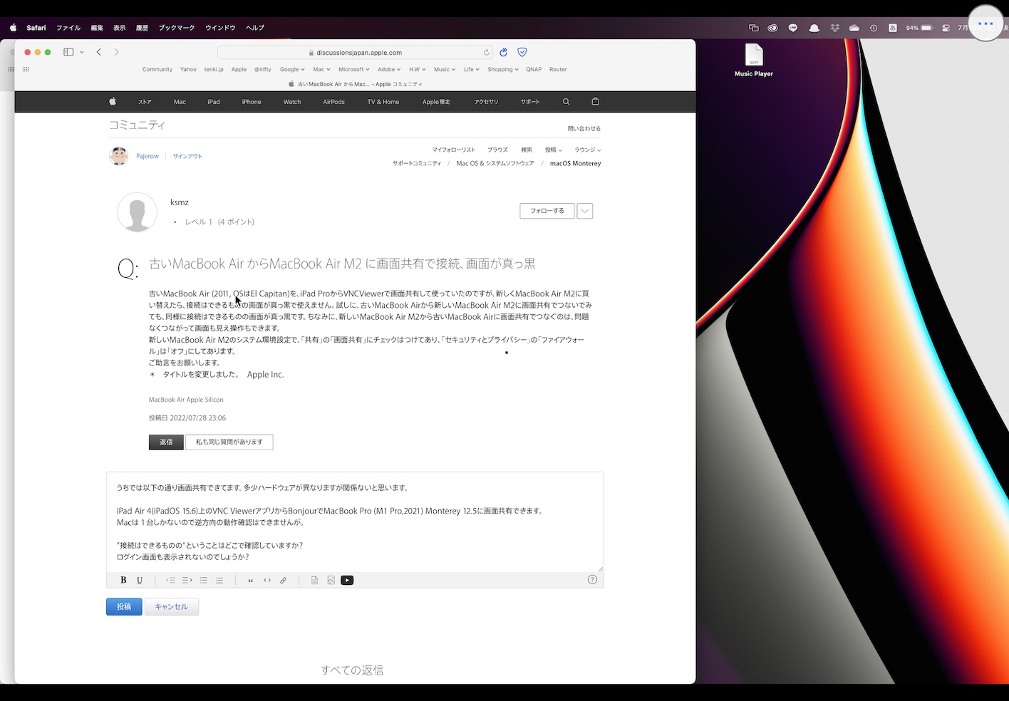 古いMacBook Air からMacBook Air M2 に画面共有で接続、画面が真っ黒
