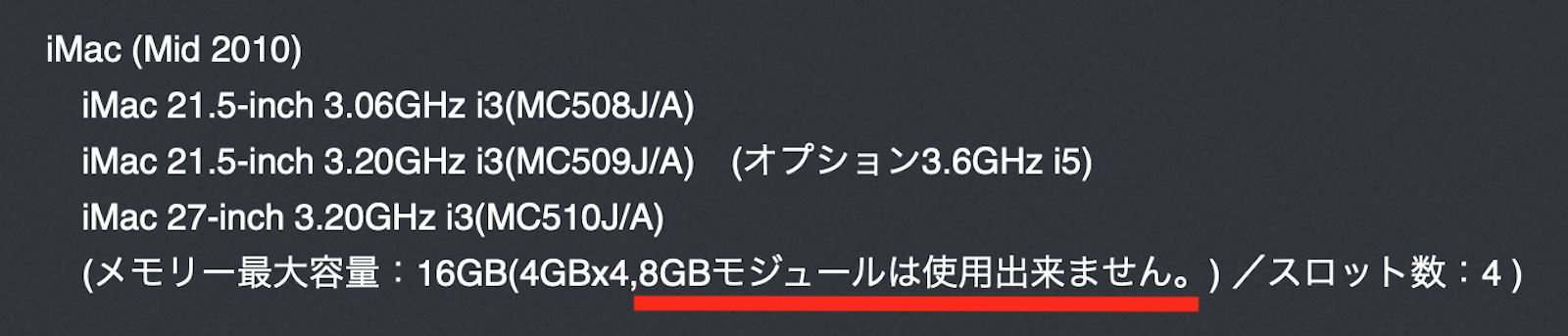iMac Mid2010の21.5インチモデルは、搭載されているメモリコントローラの仕様上、8GBのメモリモジュールは、正常に動作しません。