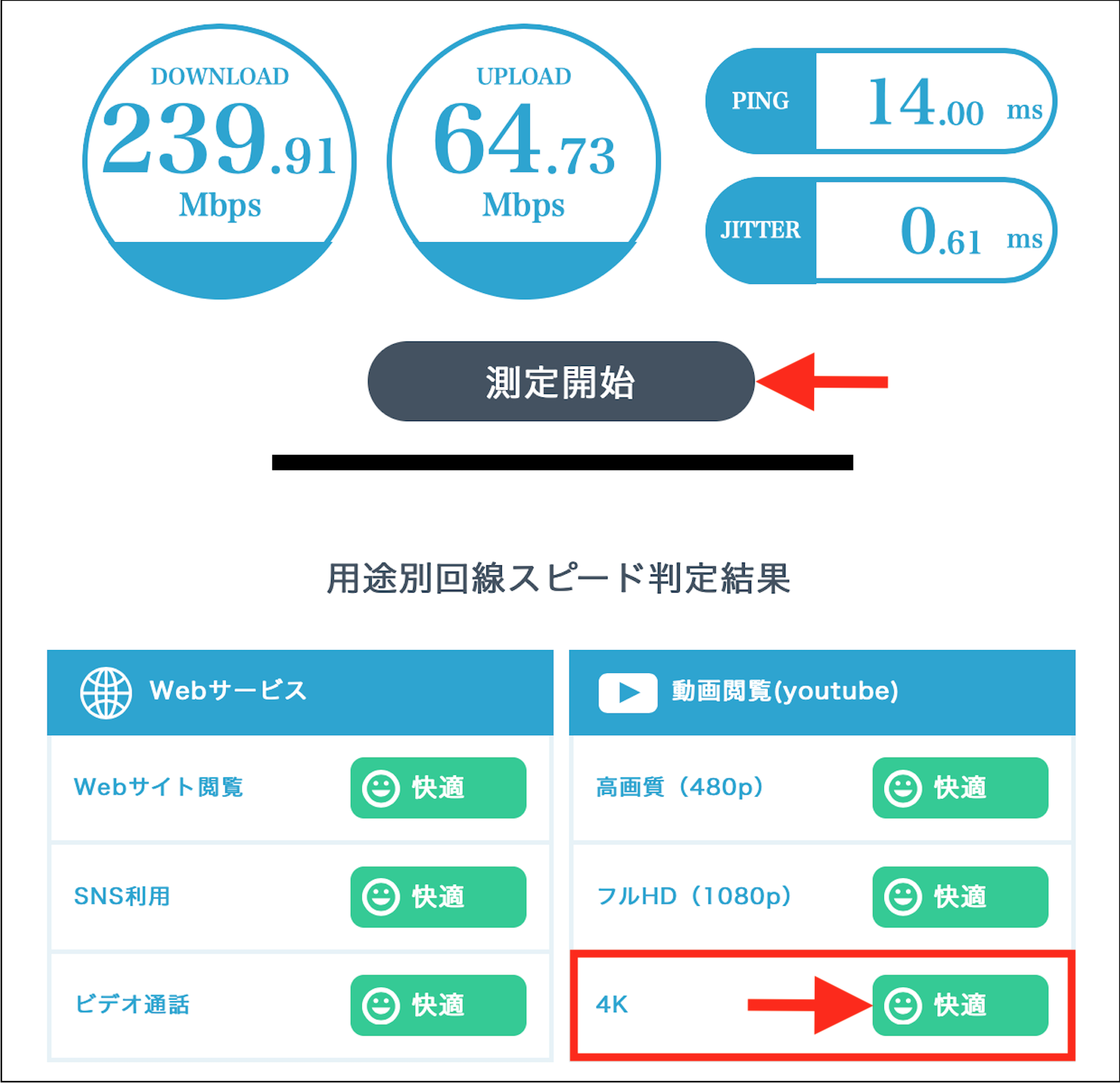 問題無く再生出来る事も有る場合は、時間帯によって通信が混雑していて、インターネット回線が遅くなり、再生に必要な速度が出ていない 可能性が有りますので、症状が発生している時に、下記リンク等でインターネット回線の速度を測定し、「用途別回線スピード判定結果」>「動画閲覧(youtube)」 >「4K」で、4K 再生が快適に行える速度が出ているか確認 して見て下さい。