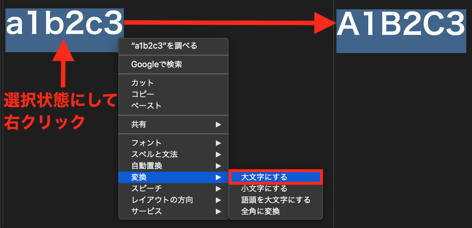 「Pages」や「Numbers」等の iWork 系アプリケーションを使用していない場合は、下の画像の様に、大文字に変換したい英数字が混ざった文字列を、選択状態にして右クリックすると表示されるメニューから、「変換」>「大文字にする」を選択して変換して下さい。