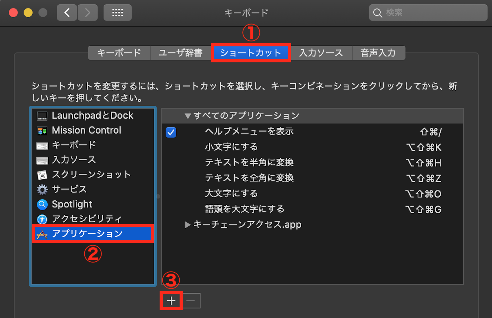 只、「Pages」や「Numbers」等の iWork 系アプリケーションの場合は、上記の操作では変換出来ません ので、全てのアプリケーションで大文字への変換を行う場合は、下の画像の様に、「システム環境設定」>「キーボード」>「ショートカット」タブで、サードバーの「アプリケーション」を選択して「+」ボタンをクリックし、