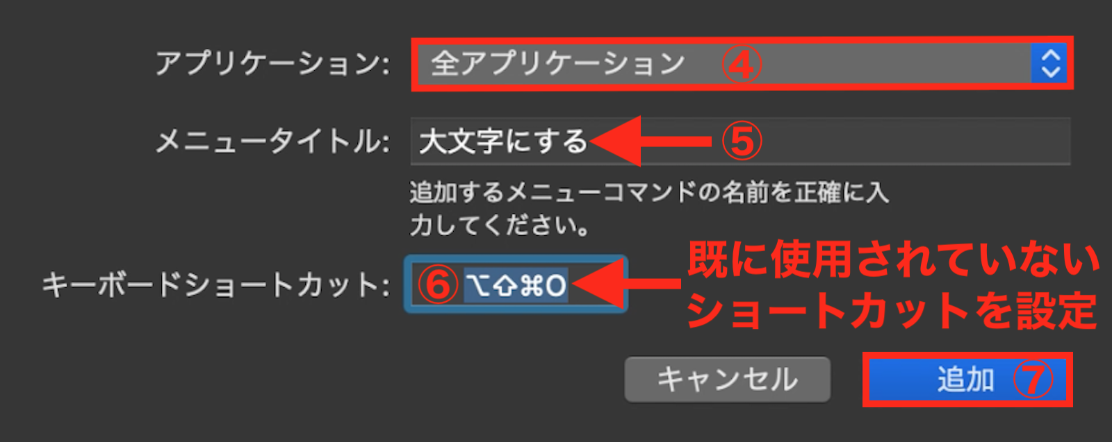 下の画像の様に、表示されるプルダウンパネルで、「アプリケーション:全アプリケーション」、「メニュータイトル:大文字にする」、「キーボードショートカット:既に使用されていないショートカット(ショートカットに設定するキーコンビネーションを実際に押して入力)」を設定して「追加」ボタンを押し、大文字に変換したい英数字が混ざった文字列を選択状態にして、設定したキーボードショートカットによる大文字変換を行なって下さい。