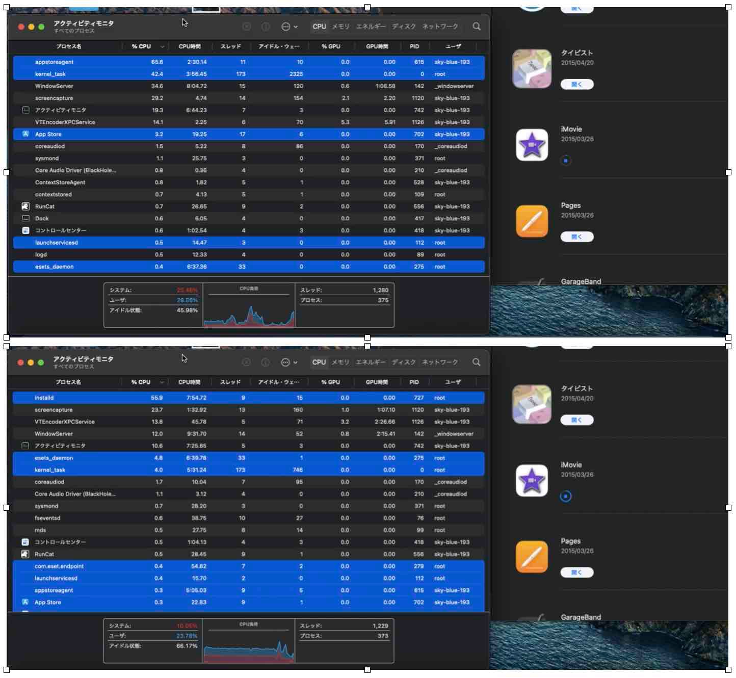 やっとこさ、iMovieのアップデートが終了すると、この2つのCPU使用は大きく減っていきました。