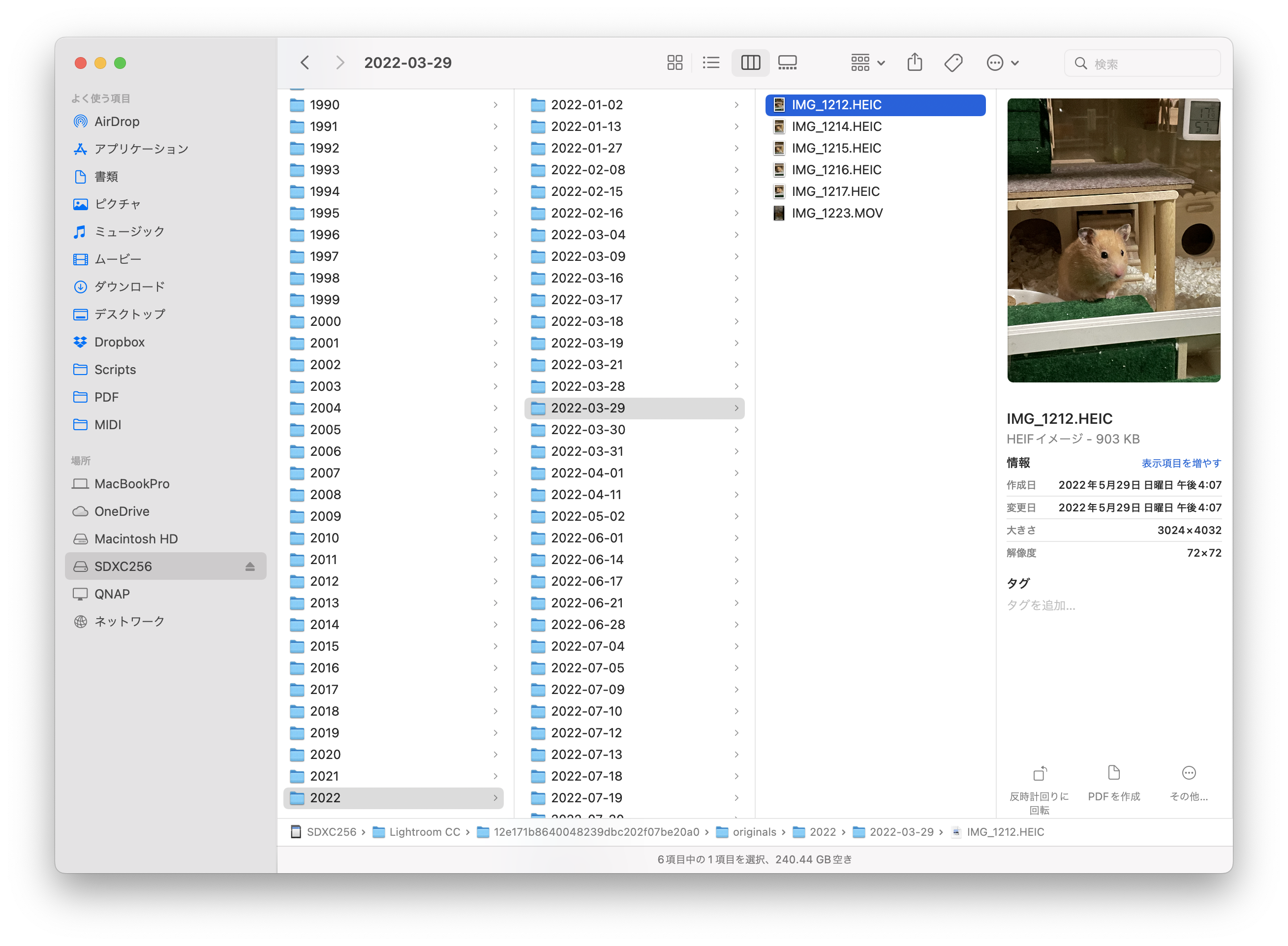 下記は私が使用しているアプリケーション(Adobe Lightroom)が自動的に作成しているフォルダ・ファイルをFinderで表示したものです.