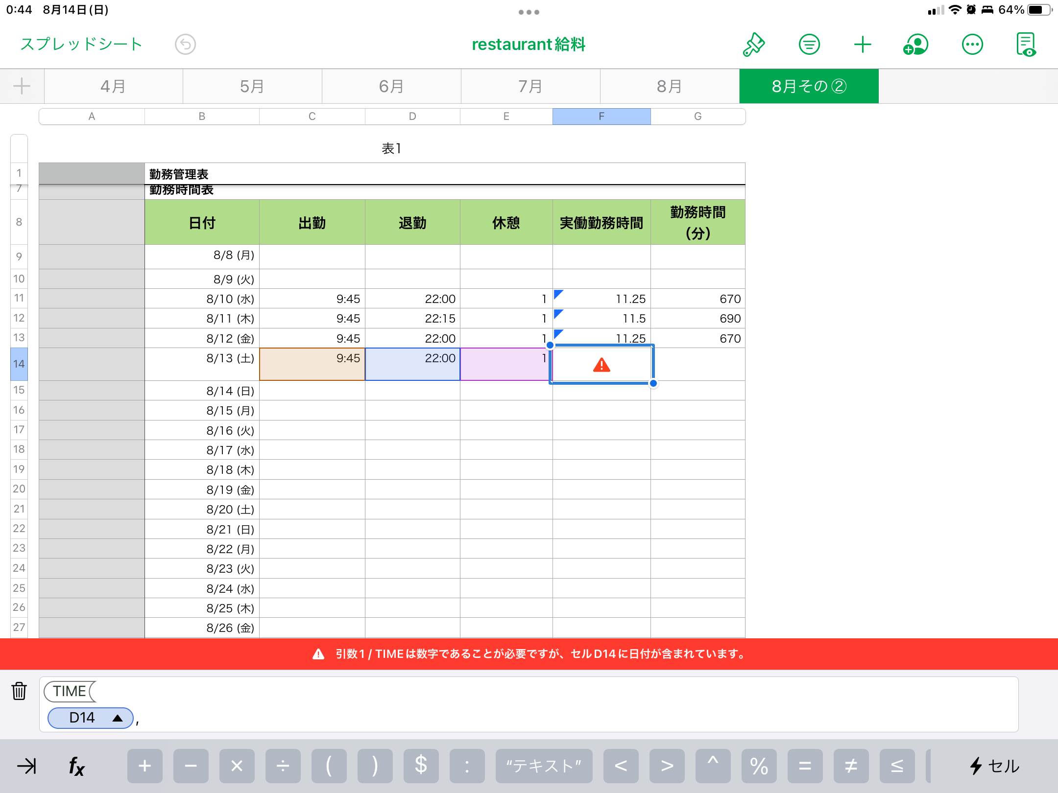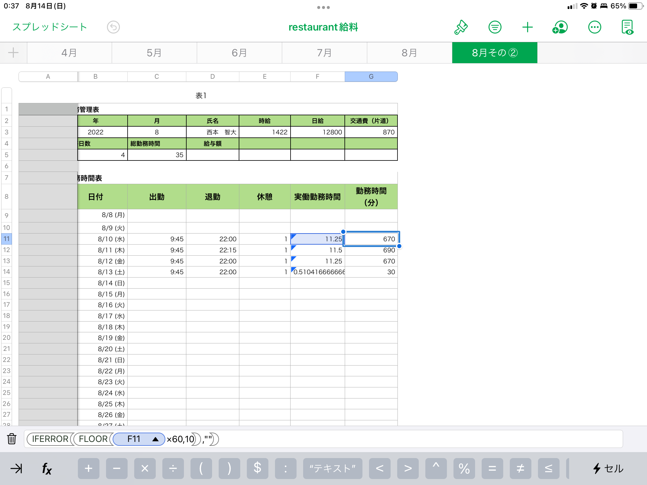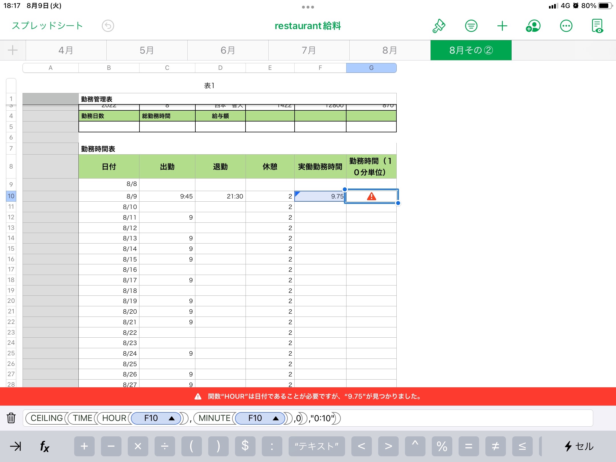 なお、F列の数式を変更すると、G列の数式も変更が必要になると思います。例えば、F14に9.75と表示されている時と9:45と表示されている時とでは、G14に設定する数式が変わってきます。9:45は数値ではなくて時刻なので、そのままではFLOOR関数がエラーになると思います。