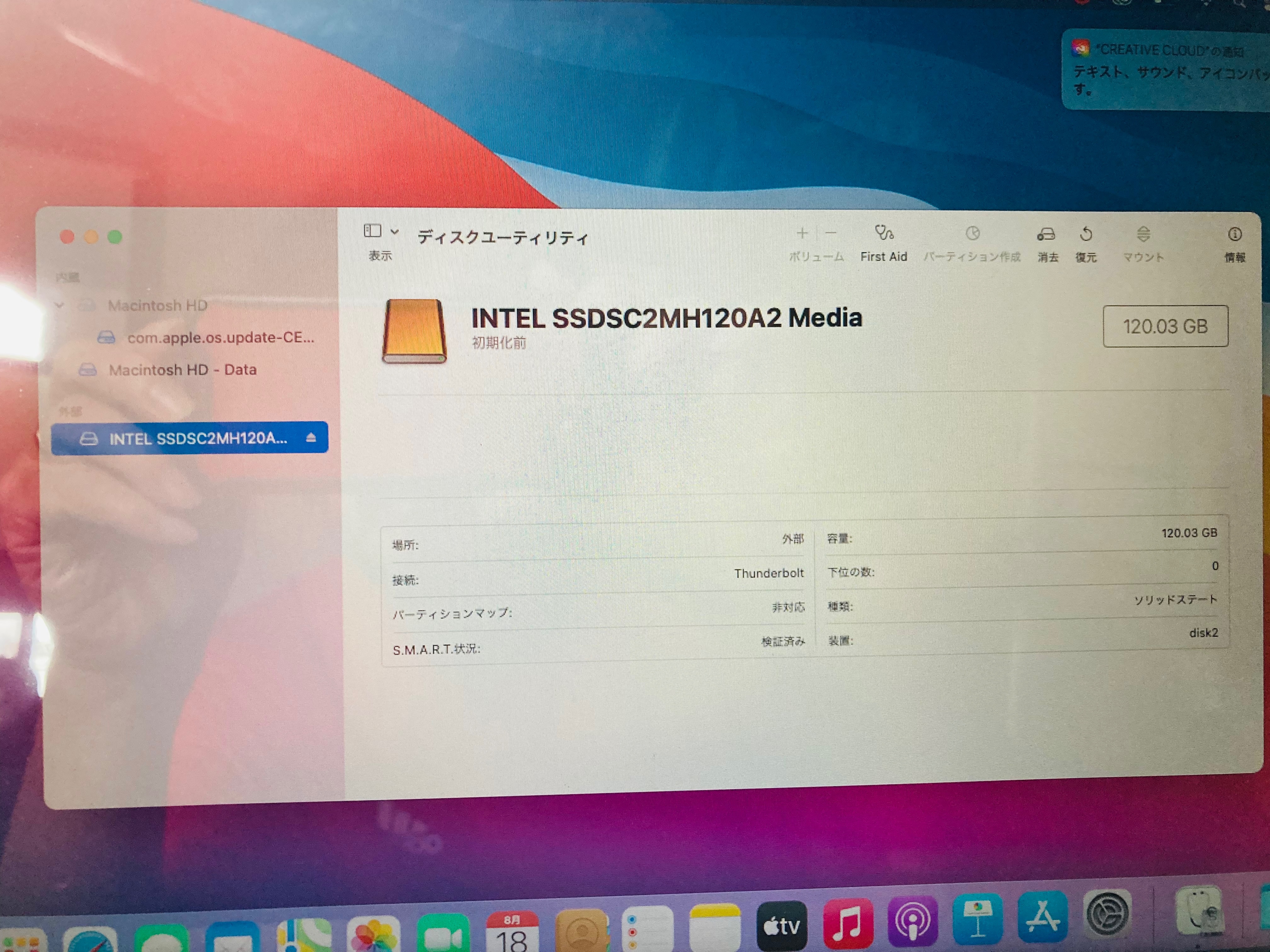 写真ではINTEL SSD ... という名前に見えます。通常はこれはSSD本体の名前です。でも、ディスクユーティリティのスクリーンショットを見ると、ボリュームのところがこの名前になってるように見えます。表示のボタンをクリックしたら、全てのデバイスを表示になってますか?それともボリュームのみを表示になってますか?後者ではないかなと思うのですが。もし後者なら、INTEL SSD ...はシステムボリューム名ということになります。