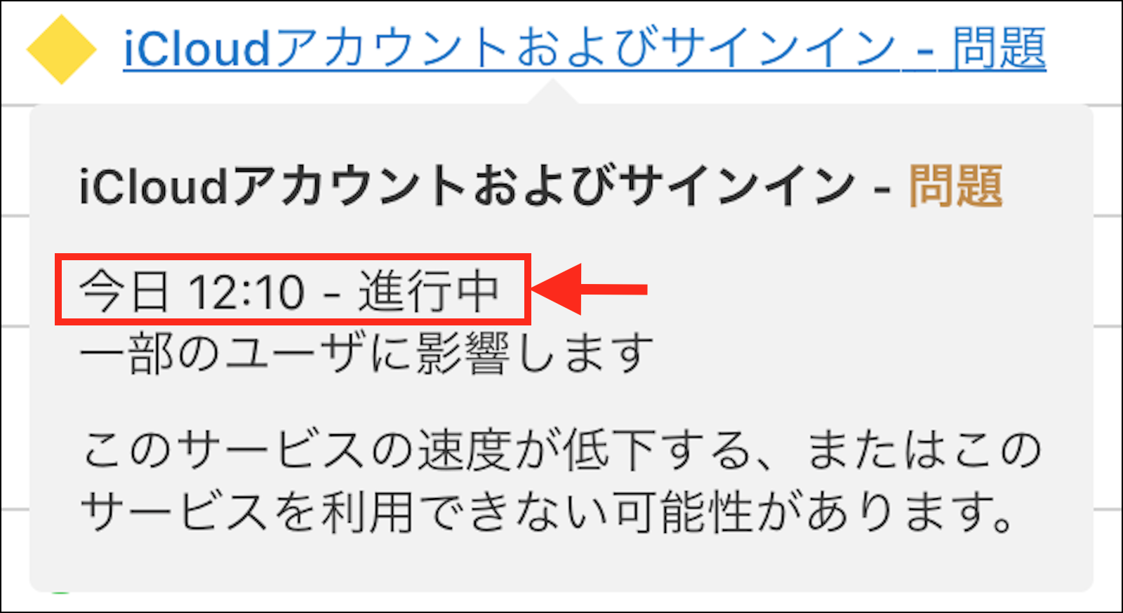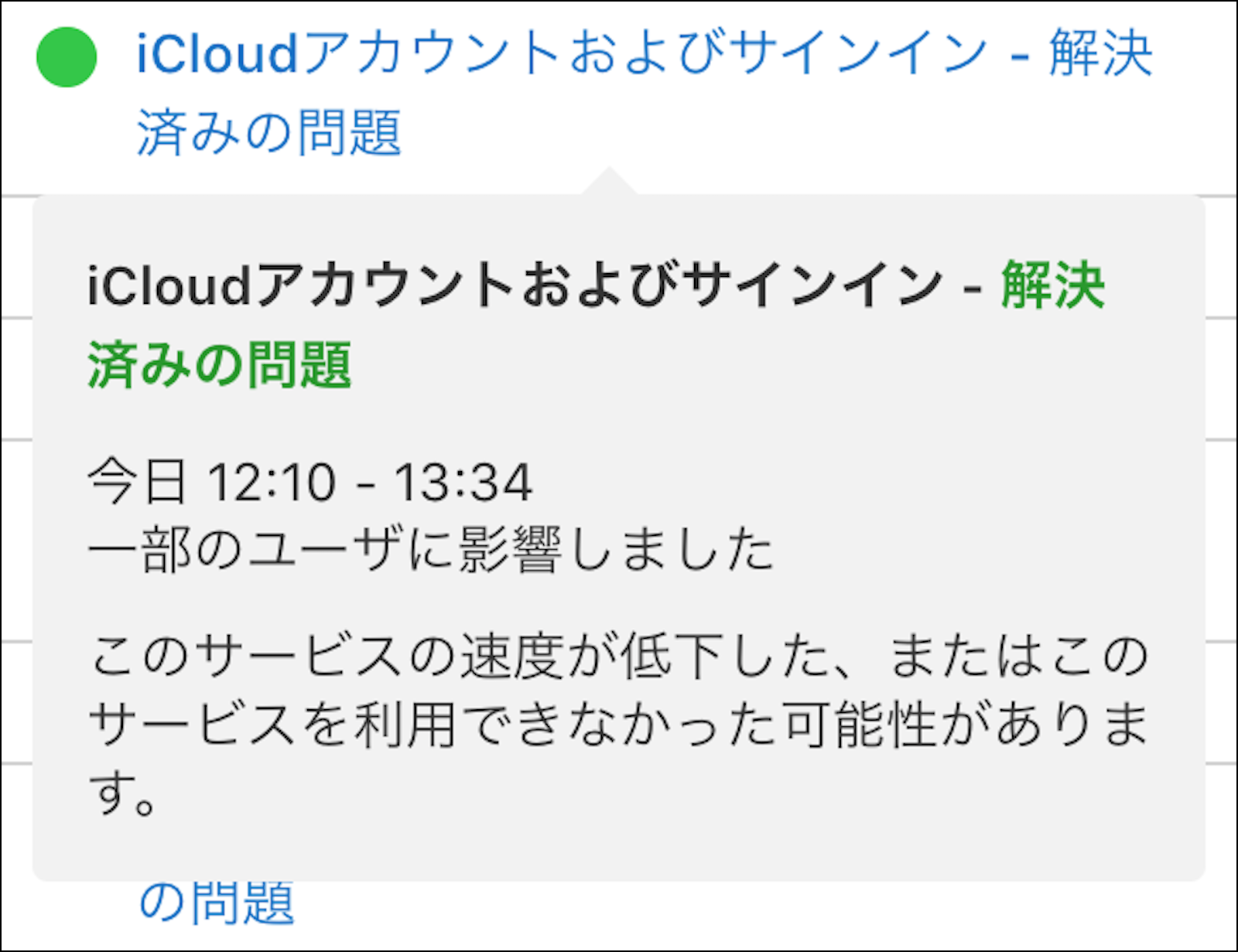 別の原因の可能性も有りますが、「iCloud アカウントおよびサインイン」の問題が、本日 12:10 より進行中ですので、Apple サポートに連絡して不具合の報告と、同様の不具合が報告されていないか確認 されて見ては如何でしょうか?