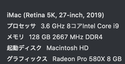 ところで「3.6GHz 8コアIntel Core i9」ということは Hyper-Threading に対応していると思いますので 16 スレッド(アクティビティモニタでは 16 コア)ではないかと思います。「アクティビティモニタ」>「ウインドウ」>「CPU使用率」や「CPUの履歴」で確認できると思います。