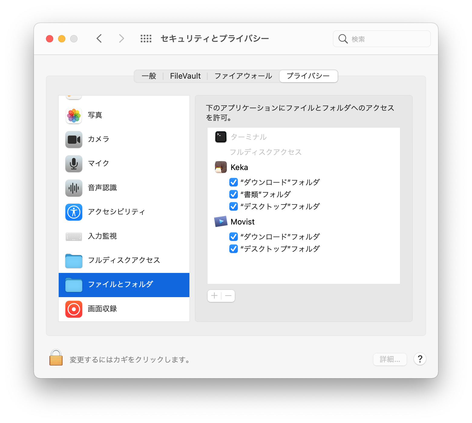 例えば動画再生アプリケーションの場合は作りによると思いますが command + O でファイルを選択するとそのファイルに関連する連番ファイルとか字幕ファイルとかにアプリケーションがアクセスする場合があります。この場合「ファイルとフォルダ」にある当該動画アプリケーションのチェックを外すと command + O でファイルを選択するたびに(当該アプリケーションが)いちいち何か聞いてきますがチェックをつければ何も聞いてきません。ということを(ということも?)想定しているのかも知れません。