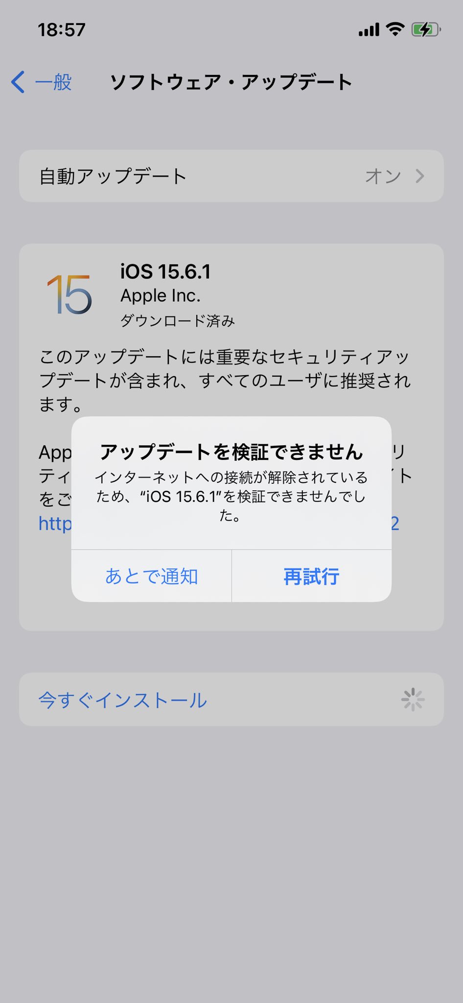 Wi-Fiも繋がっているし、充電も充分にある状態でアップデートしても「アップデートを検証できません」と表示されます。
