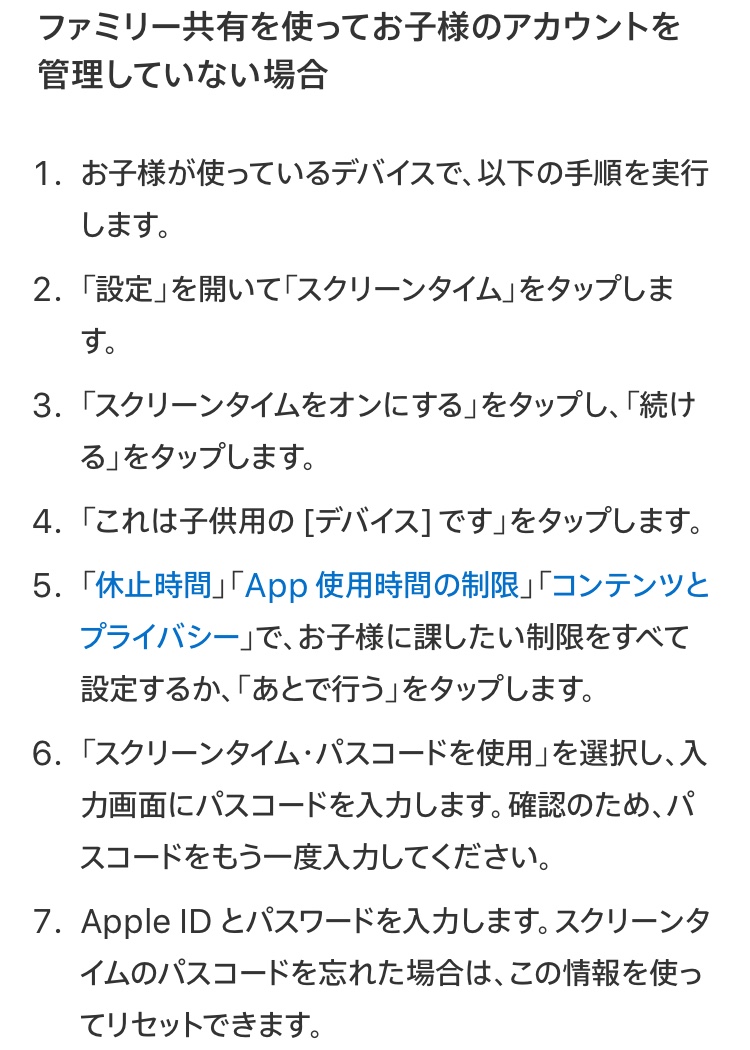 保護者がアンドロイド、子供がiPhoneを使用しています。そのため、ファミリー共有などはせずに、子供のiPhoneで子供向けのスクリーンタイムを設定しているのですが、パスコードの変更から子供のアップルidを入力すると、子供が自分でパスコードを変更し、解除されてしまいます。初期設定の際にApple IDの入力をキャンセルし、スキップを押したのですが、子供のApple IDで解除されてしまいます。対処法を教えていただければ幸いです。