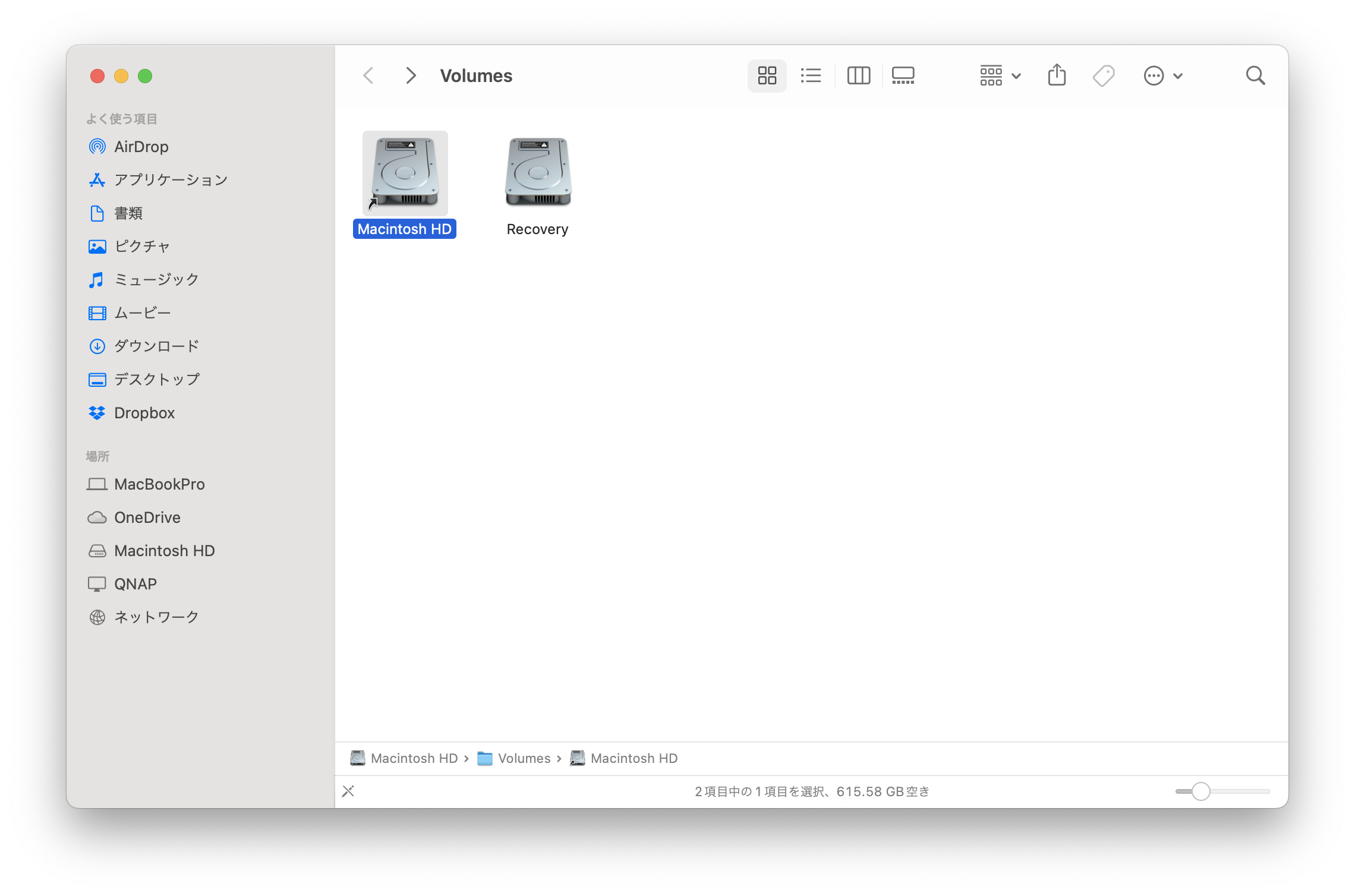 ・ファインダーで"/Volumes"を表示すると、全てのボリュームが表示される。