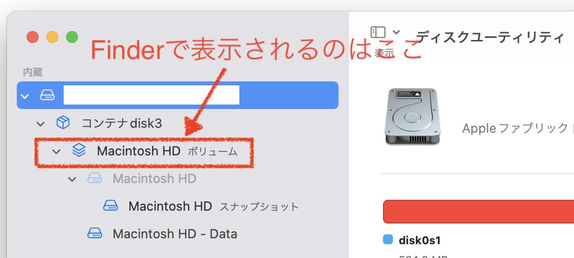 Finderで表示されるのは上位の「ボリュームグループ:Macintosh HD」で、その中にはデータボリュームも含まれています。