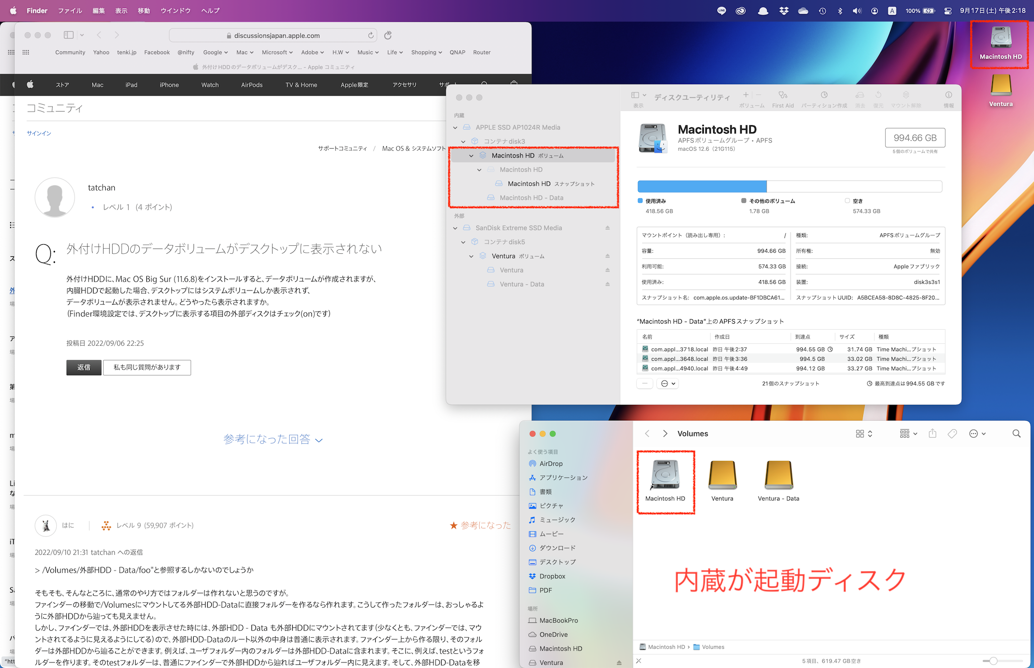 引用:ファイルとデータは、「Macintosh HD - Data」という別のボリュームに保管されます。Finder では、両方のボリュームが「Macintosh HD」として表示されます。