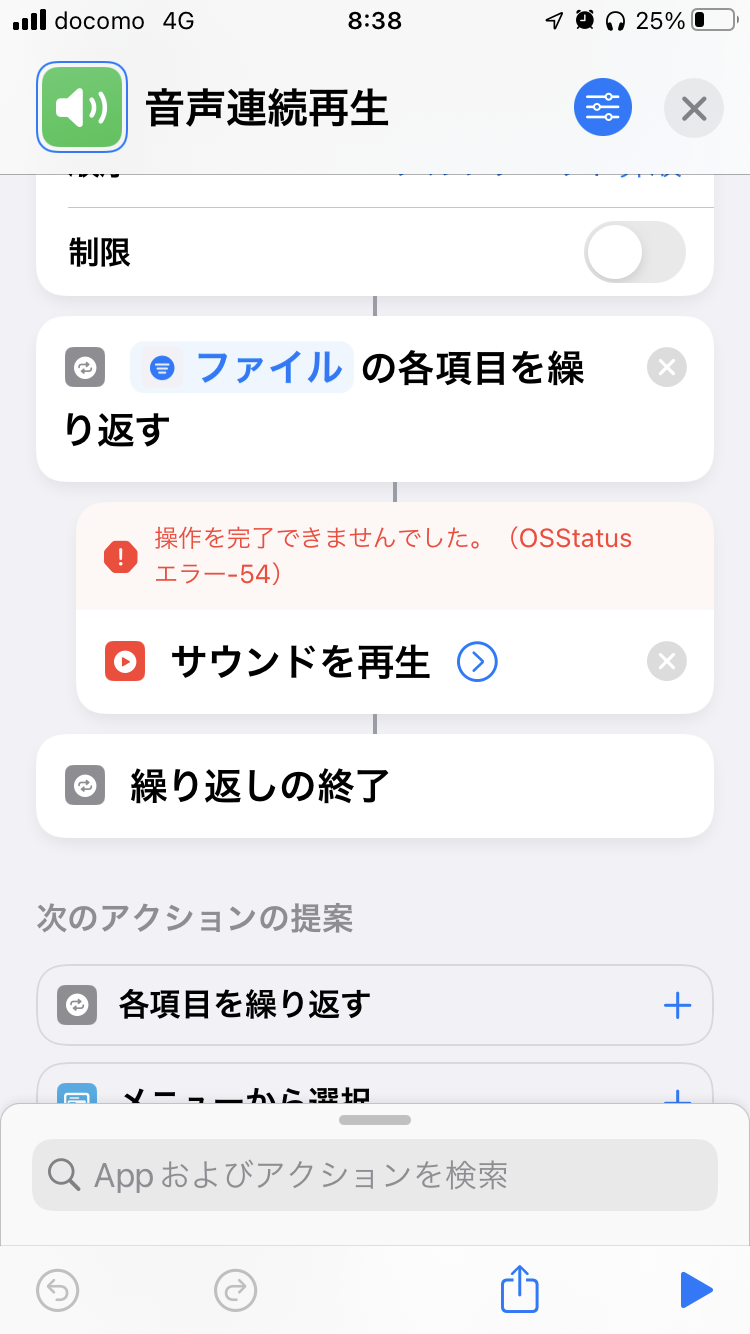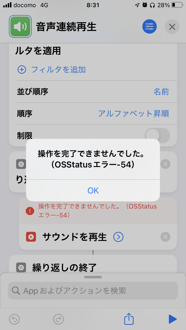 ショートカット - 音声連続再生させるとosstatusエラー54 にて停止する