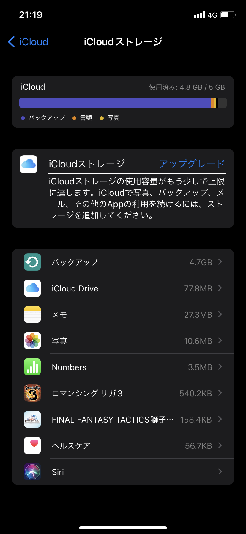 この一個前の画面ではバックアップの容量が4.7Gと表示されてるが、バックアップはオフにしてある。