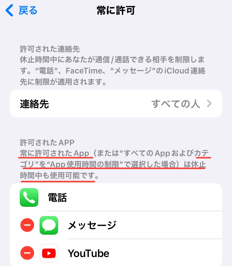 「許可されたapp」の項目に、YouTube等があればずっと使えてしまうので、それらを変更する必要があります。
