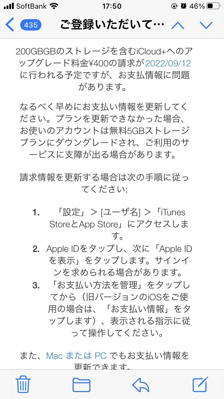 (iCloud+ のストレージプラン(200 GB)を利用されていない場合や、更新日が異なる場合は、フィッシングメール確定)