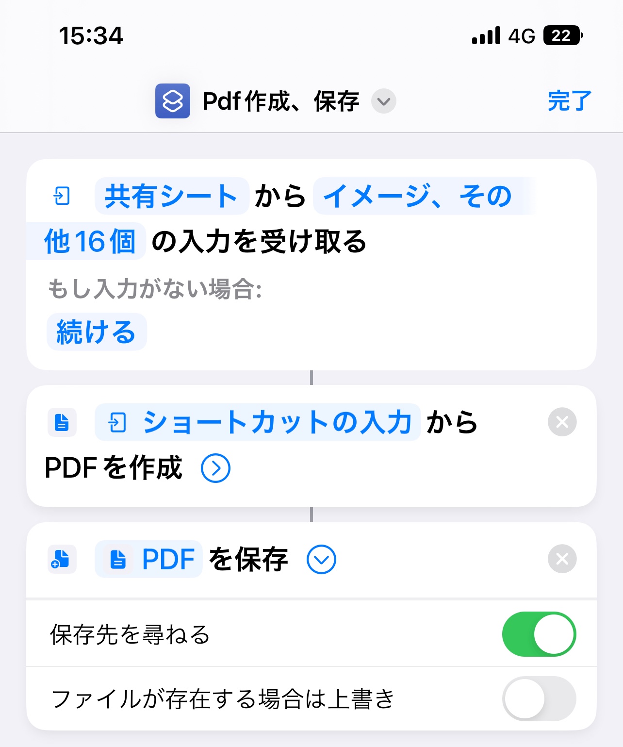 iOS16にアップしたところスキャン画像と写真画像はぞれぞれ1頁毎に印刷出力になり、全体をまとめてPDFになりません。