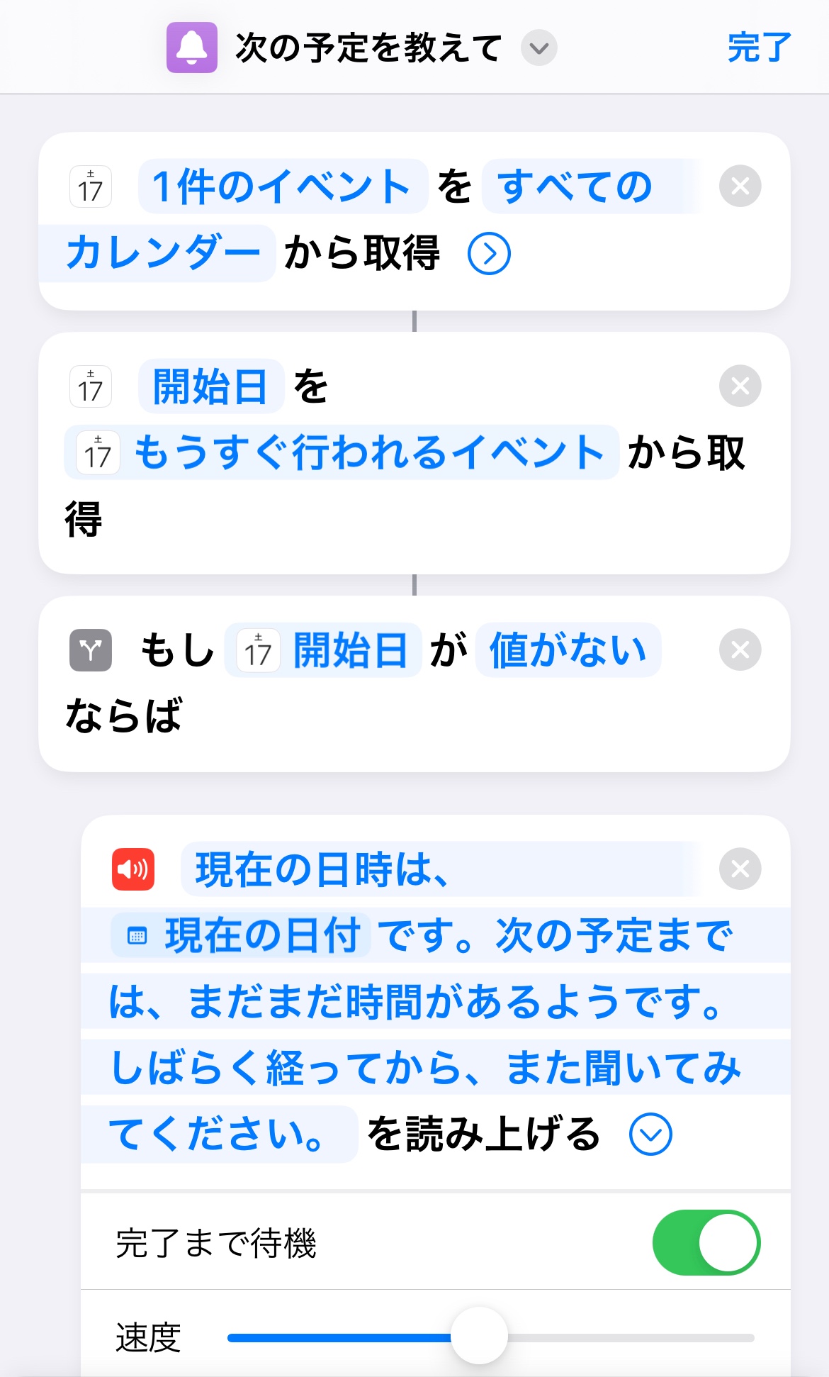 もともとは、単純にSiriにカレンダーのイベントタイトルを時間の少し前になったら、読み上げてもらいたいというものでした。