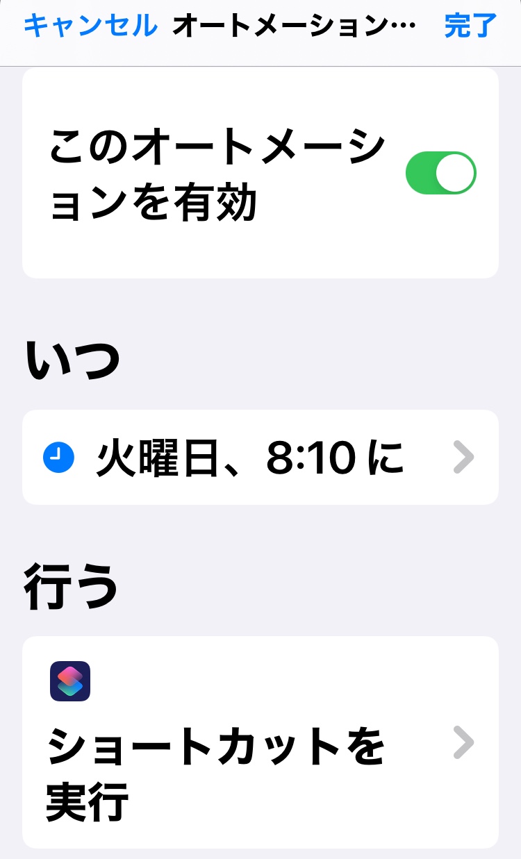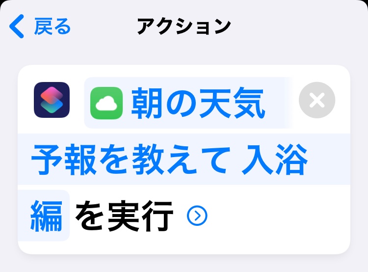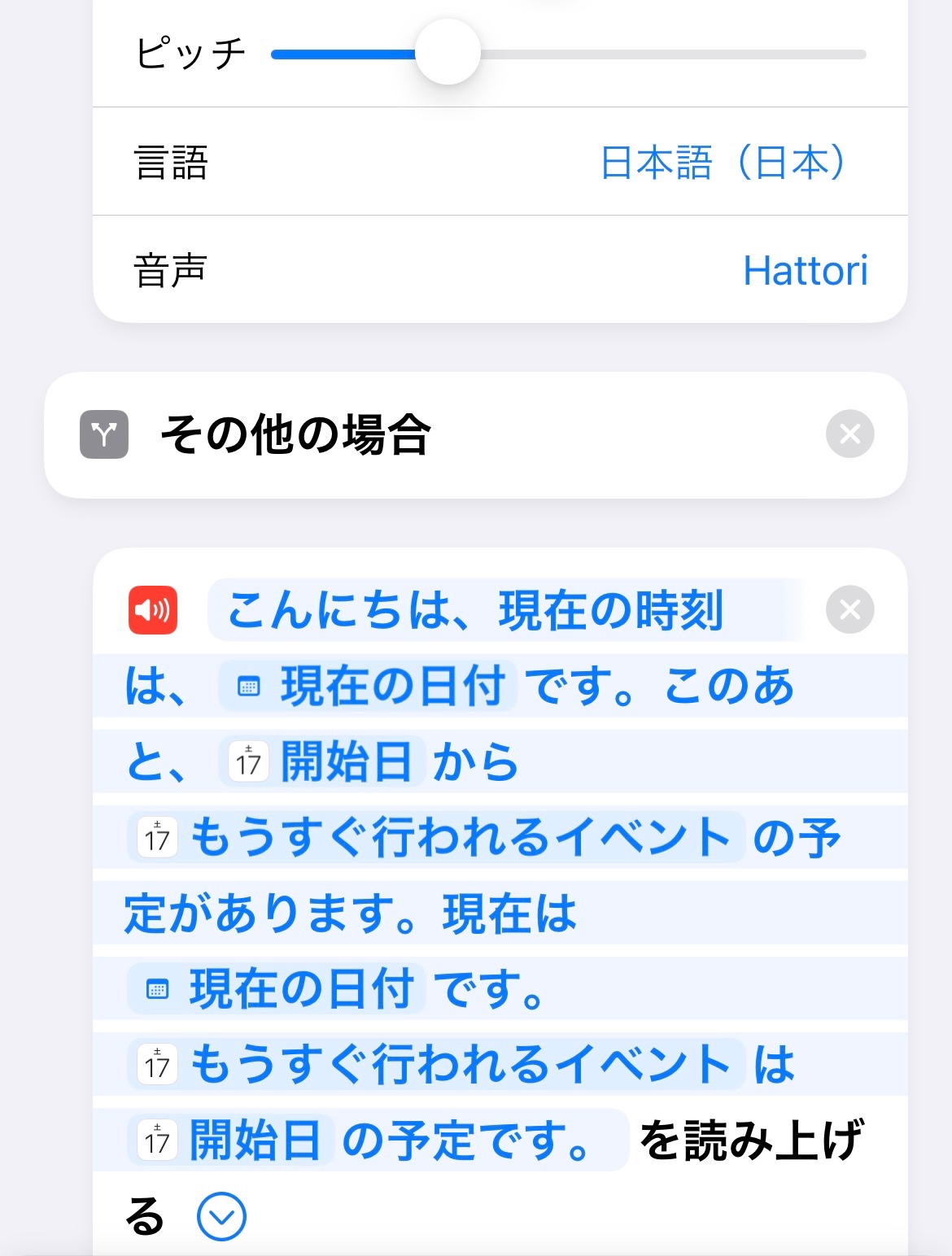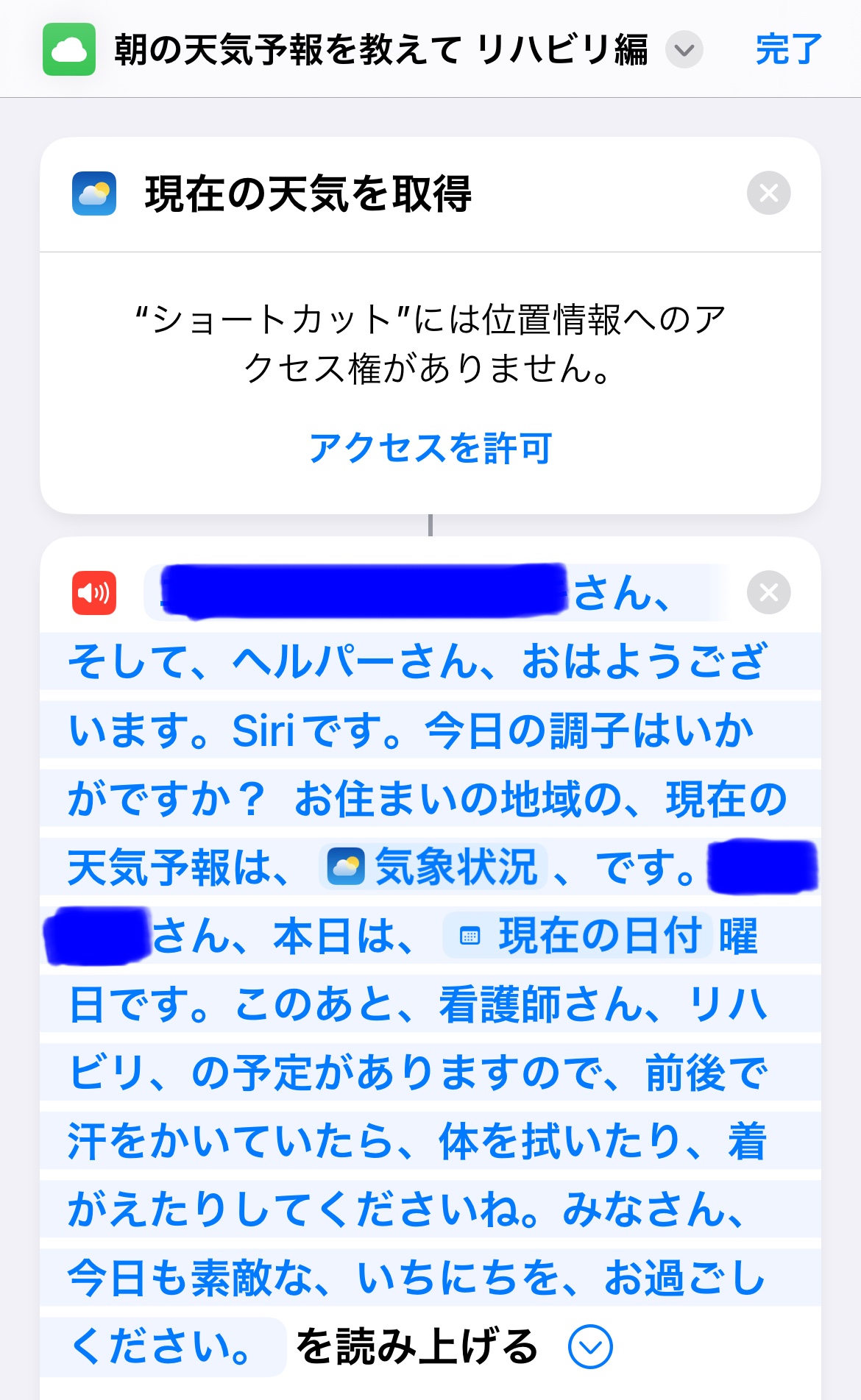 ショートカットの使い方はネットで調べつつ、「天気」や「カレンダー」から情報を取得して、それを「書類→テキストを読み上げる」の中で「現在の日付」「もうすぐ行われるイベント」と共に音声で読み上げてもらうもので、読み上げるテキスト内容の違うショートカットを10種類くらい作成しました。