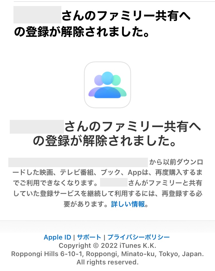 ファミリー共有で自分のアカウントを押すと、ファミリー共有の使用を停止と出るのですが停止すると通知は行きますか?