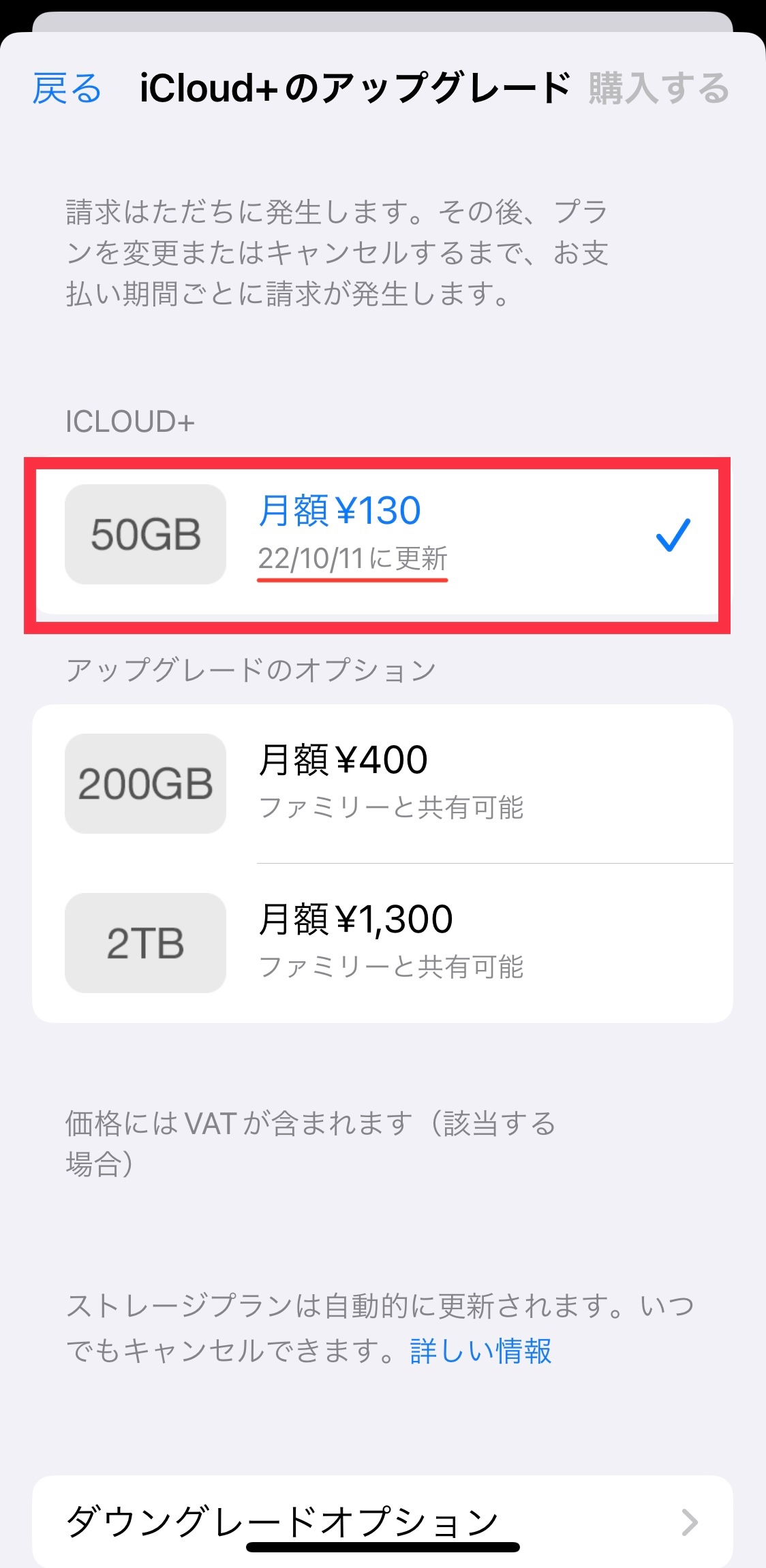 現在のプランからアップグレードを更新時にちょうど行うには、私の場合は22/10/10までにすればよいということがわかります。
