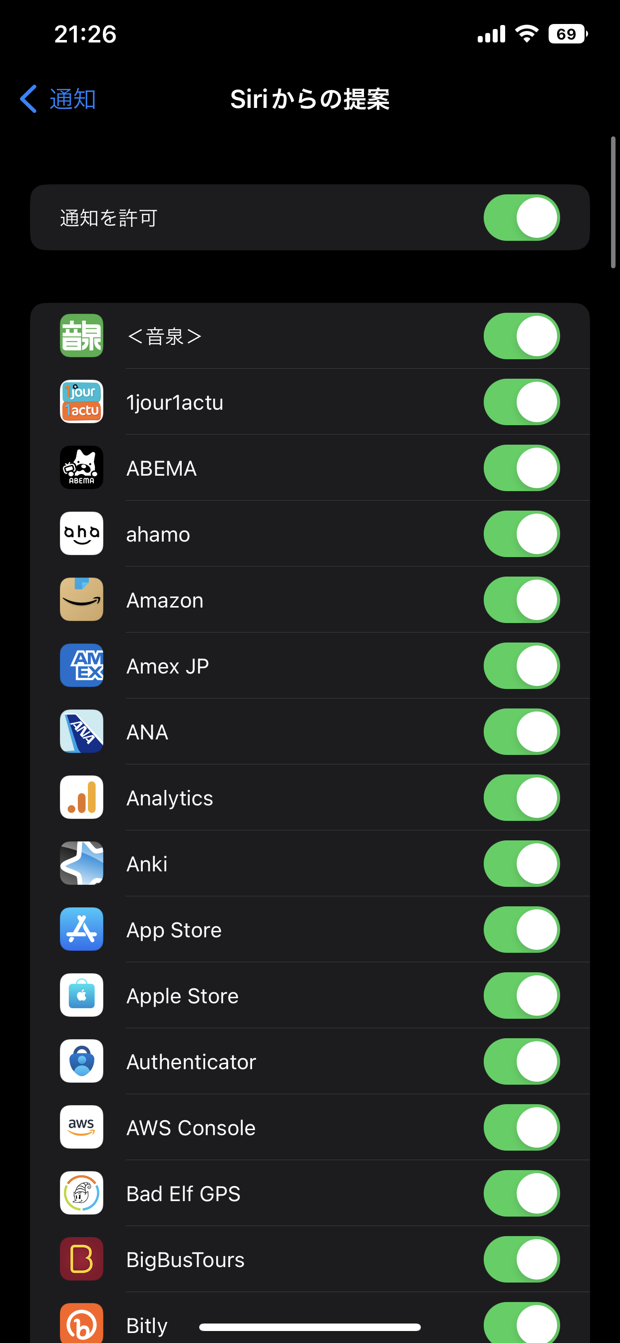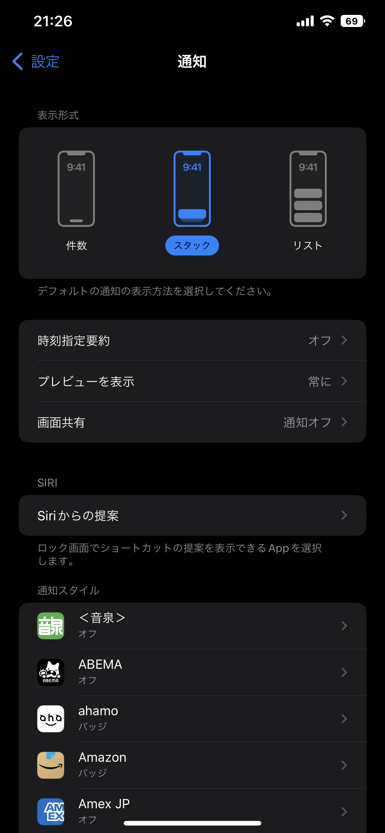 1)設定の通知、各アプリの通知設定を以下のように設定する。