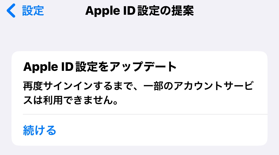 「Apple ID設定をアップデート」と表示され、「再度サインインするまで、一部のアカウントサービスは利用できません」と出てきます。【続ける】をタップしても反応無し。 たまにパスワード入力画面になりますが、入力しても何も変わらず。 どう対処すれば良いんでしょうか...