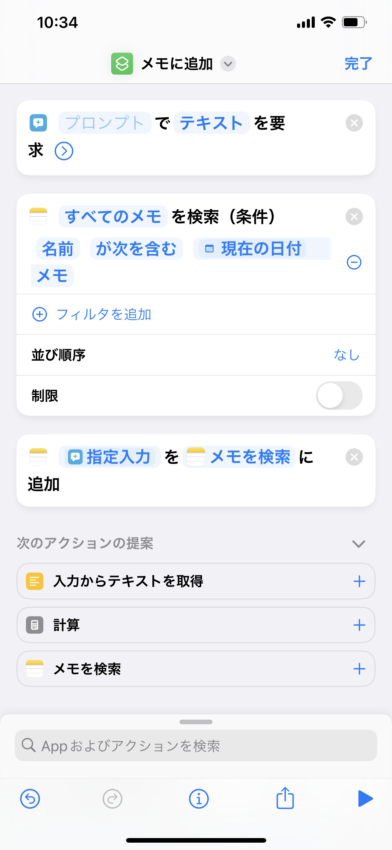 ショートカットアプリで、検索結果のメモに追記したい(iOS16)
