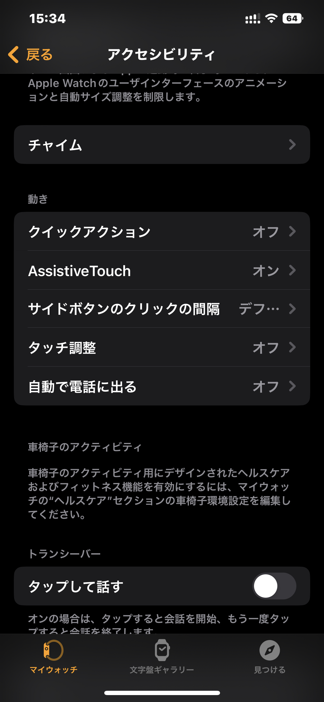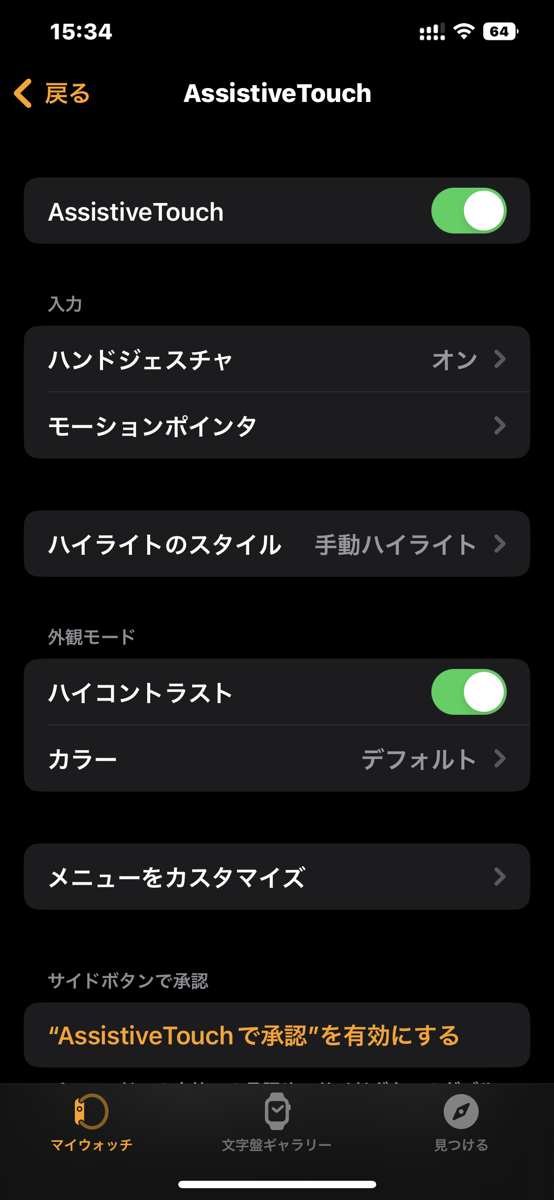 とは言ってもそれまで煩わしいのでなんとか消したいですよね。「watchアプリ→アクセシビリティ→AssistiveTouch→オフ」。そして再起動。これでとりあえずは消えます。ただ翌日にはまた表示されます。