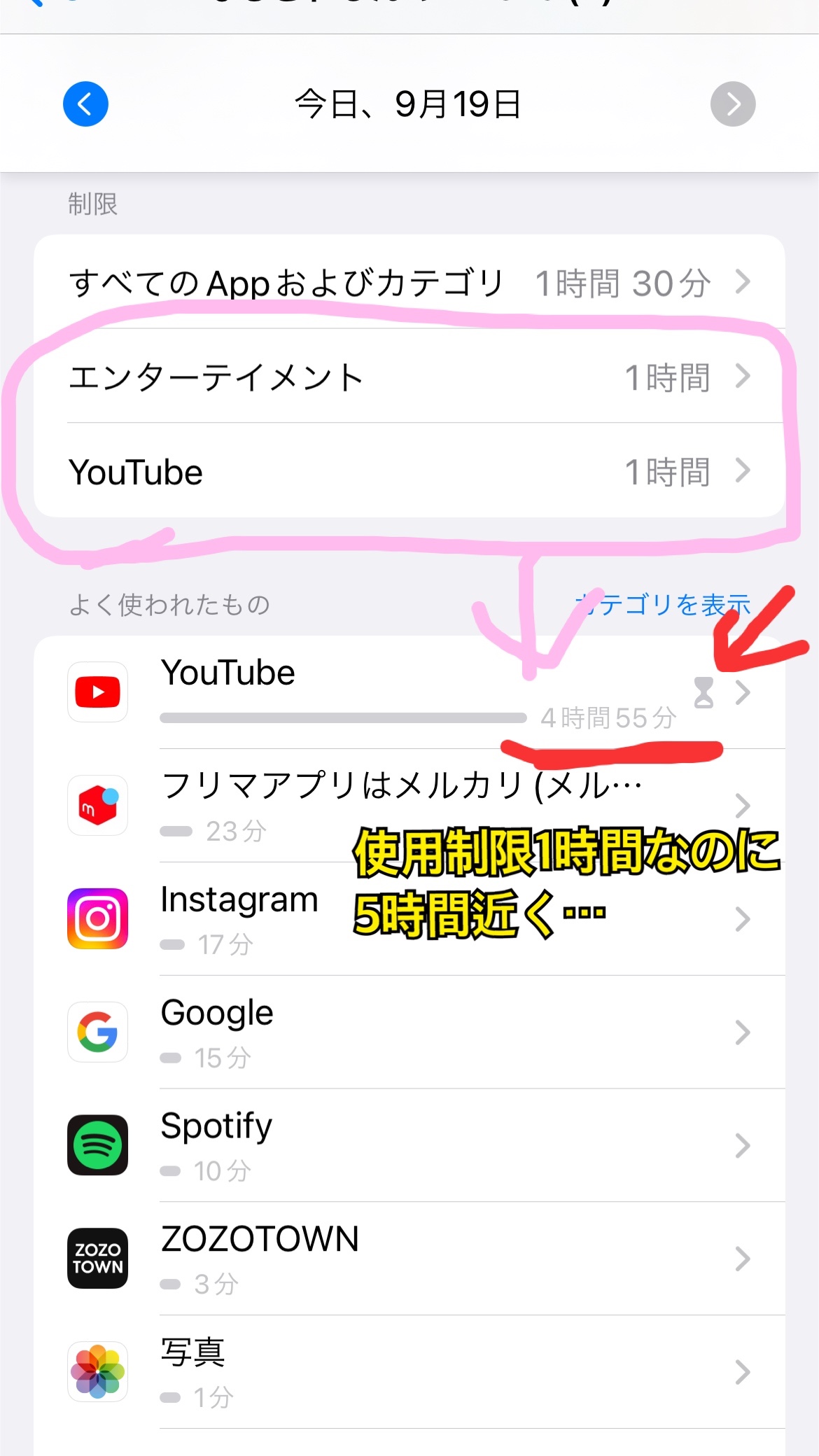 ②youtubeアプリ個別に制限をかけて砂時計になっているのに制限時間以上使えている。