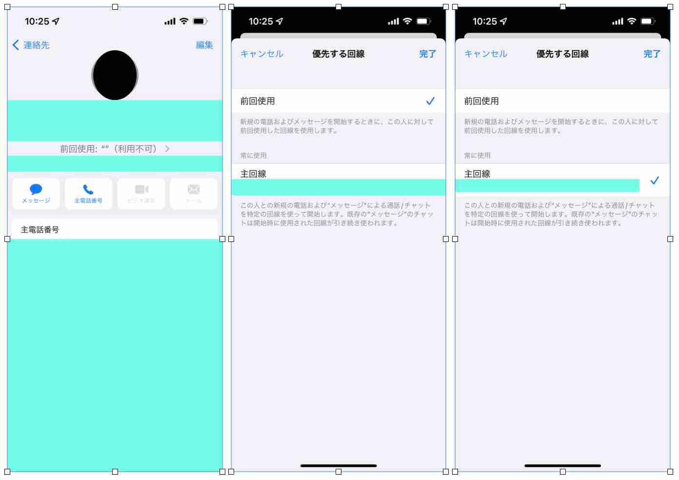 この状況で電話帳を見ると特定の条件なくランダムに「優先する回線」が「前回使用」がデフォルトで選択されており、なおかつ音声通信プランの契約がないIIJのeSIMが選択されています。