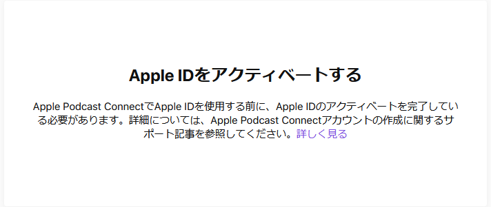 Podcastを始めたく、Apple IDを作成してApple Podcast Connectにアクセスしたところ、「Apple IDのアクティベートを完了している必要があります」と表示されます。諸々調べたところ、Apple IDのアクティベートには①クレジットカードの登録②メディアサービス規約への同意 が必要とありました。①については対応済みですが、②の同意するための画面をどうしても見つけられません(規約本文が掲載されているページはありますが、同意のためのボタンや遷移リンクは見つけられず、同意のアクションをどのように起こせばいいのか不明)。