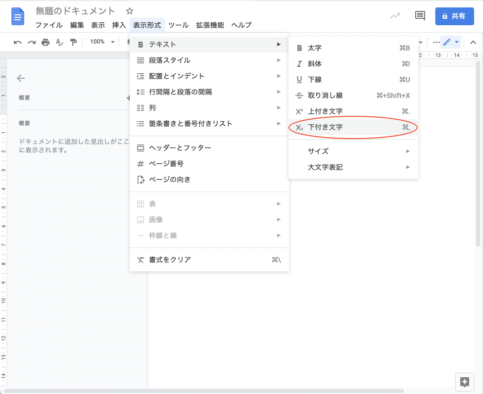 MacでGoogleドキュメントの「下付き文字」ショートカットを行う方法はありませんか?
