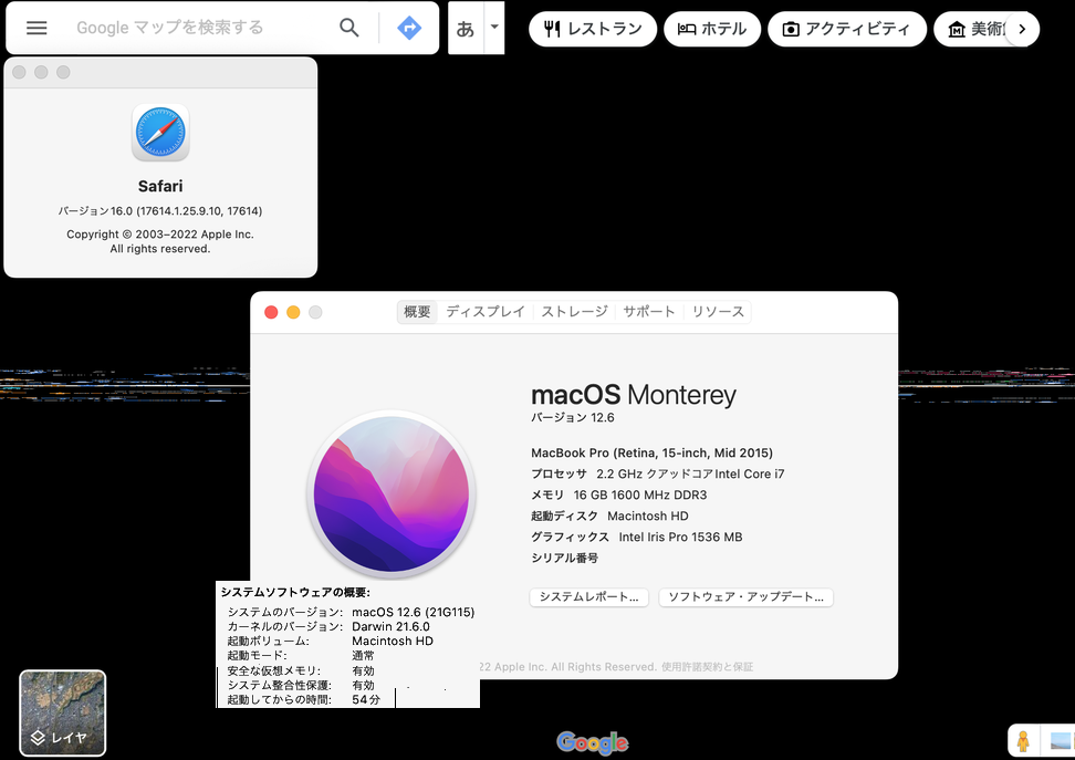 mac OS 12.6 (21G115), Safari16.0 (17614.1.25.9.10, 17614)にアップデート後、SafariでGoogleMapが使えなくなりました。一瞬地図が表示された後真っ黒の画面に横筋が出ます。