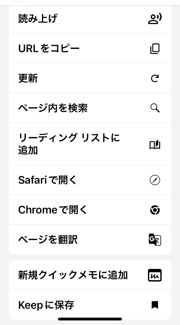 Webサイトで、 をタップし、オプションのリストを下にスクロールしてから、「ホーム画面に追加」をタップします。