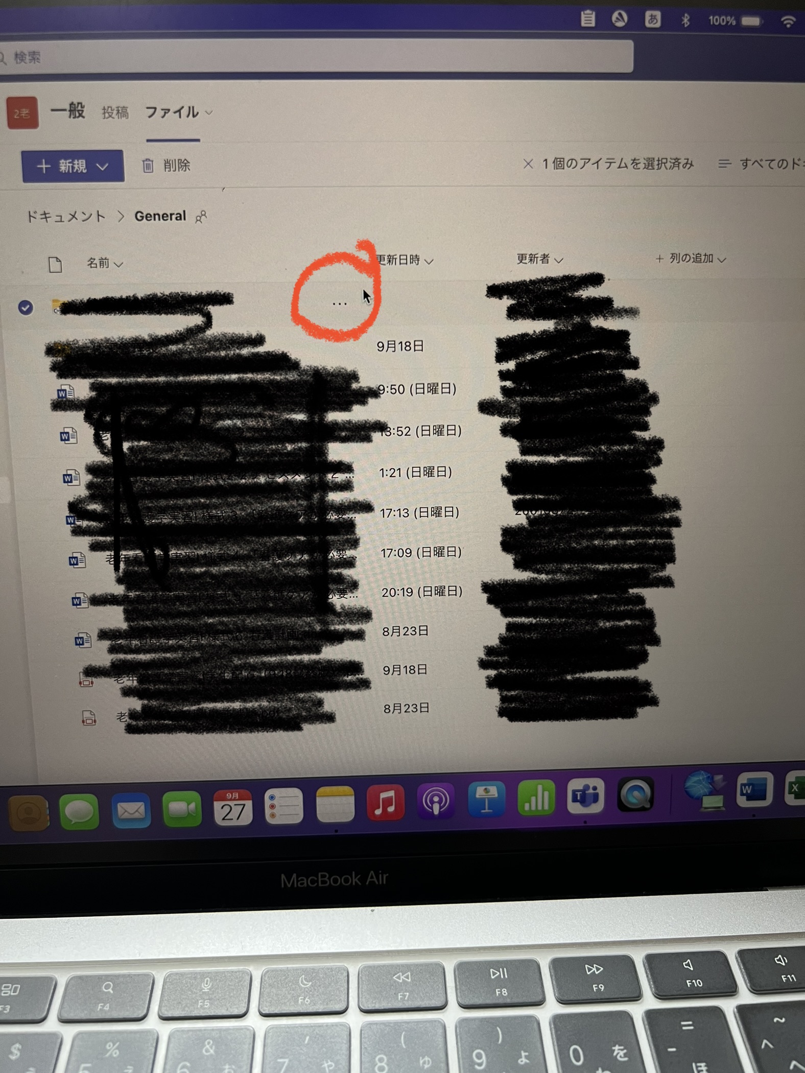 アプリはWordです。このピンクの囲っているところがファイルです。そのファイルに課題などが上げられていてそれを保存すると文字化けしてしまいます。