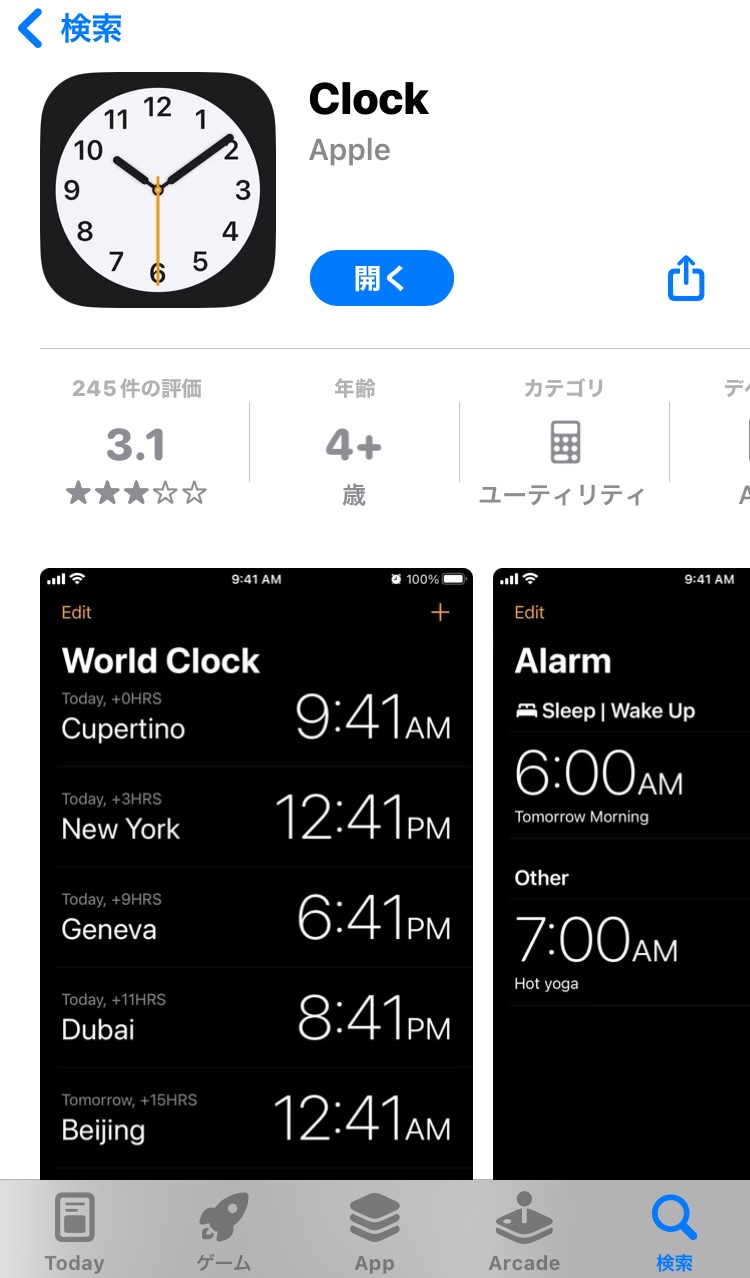 ・ 削除してしまったのなら、App Storeで「Clock」と入力して検索。