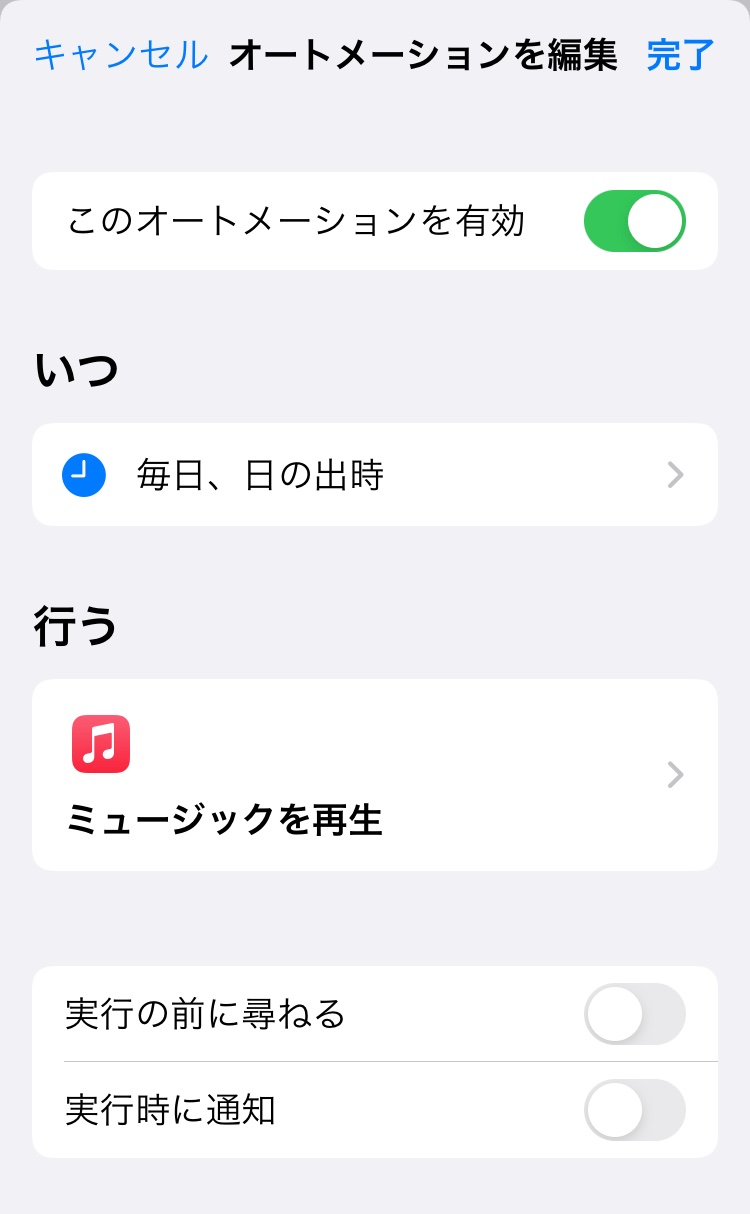 私は、日の出で「ショートカット実行」にして、ショートカットの内容をミュージック再生としてみましたが、