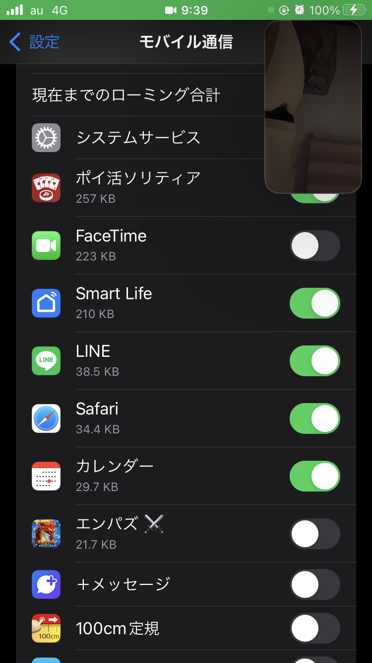 ・バックグラウンドでデータ通信が行われていて、外出中はモバイルデータ通信、Wi-Fi環境下ではWi-Fiでパケットを無限に使用している。