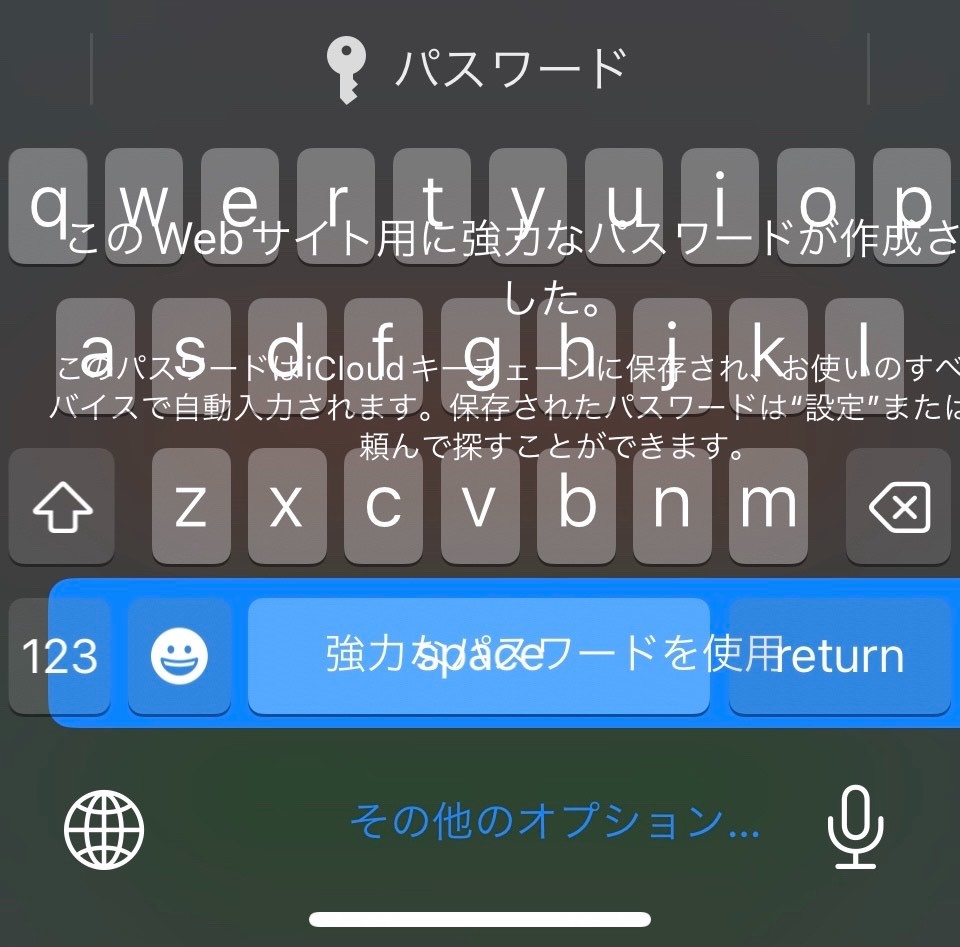 iPhoneにてメールアドレスやパスワードを入力する際に表示される際のキーボードの表示にパスワードの生成に関する表示が重なって表示されます。
